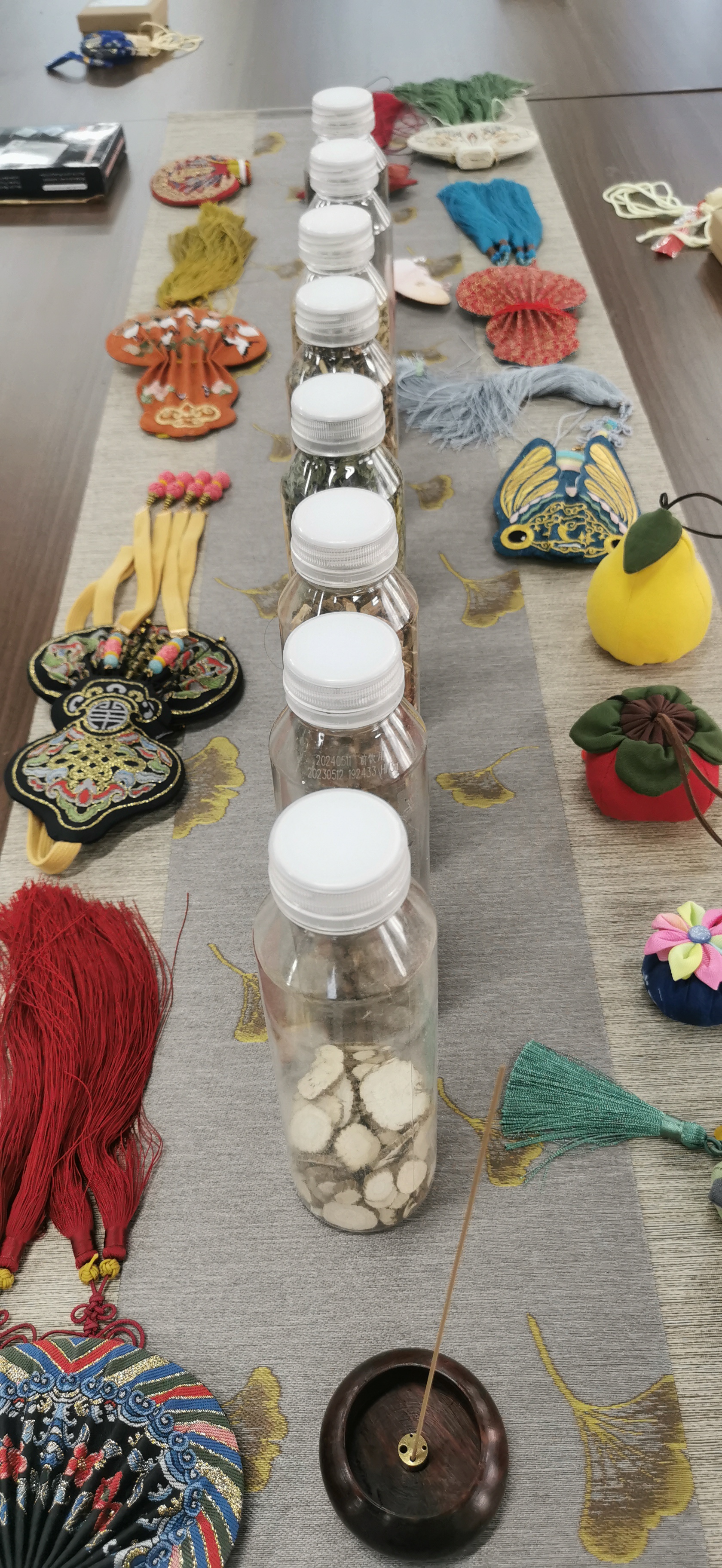 在了解了香囊的文化背景后,进入了最令人期待的香囊制作环节。龚老师为留学生和银龄教师展示了丰富多样的故宫复制款香囊样品,包括色彩鲜艳的绸缎布料、精美绝伦的传统纹样以及不同的刺绣工艺、中国结和流苏配饰等;也给留学生准备了8种中草药原材,在老师的耐心指导下,留学生们纷纷拿起香材一一品闻,开始动手制作属于自己的端午香囊。