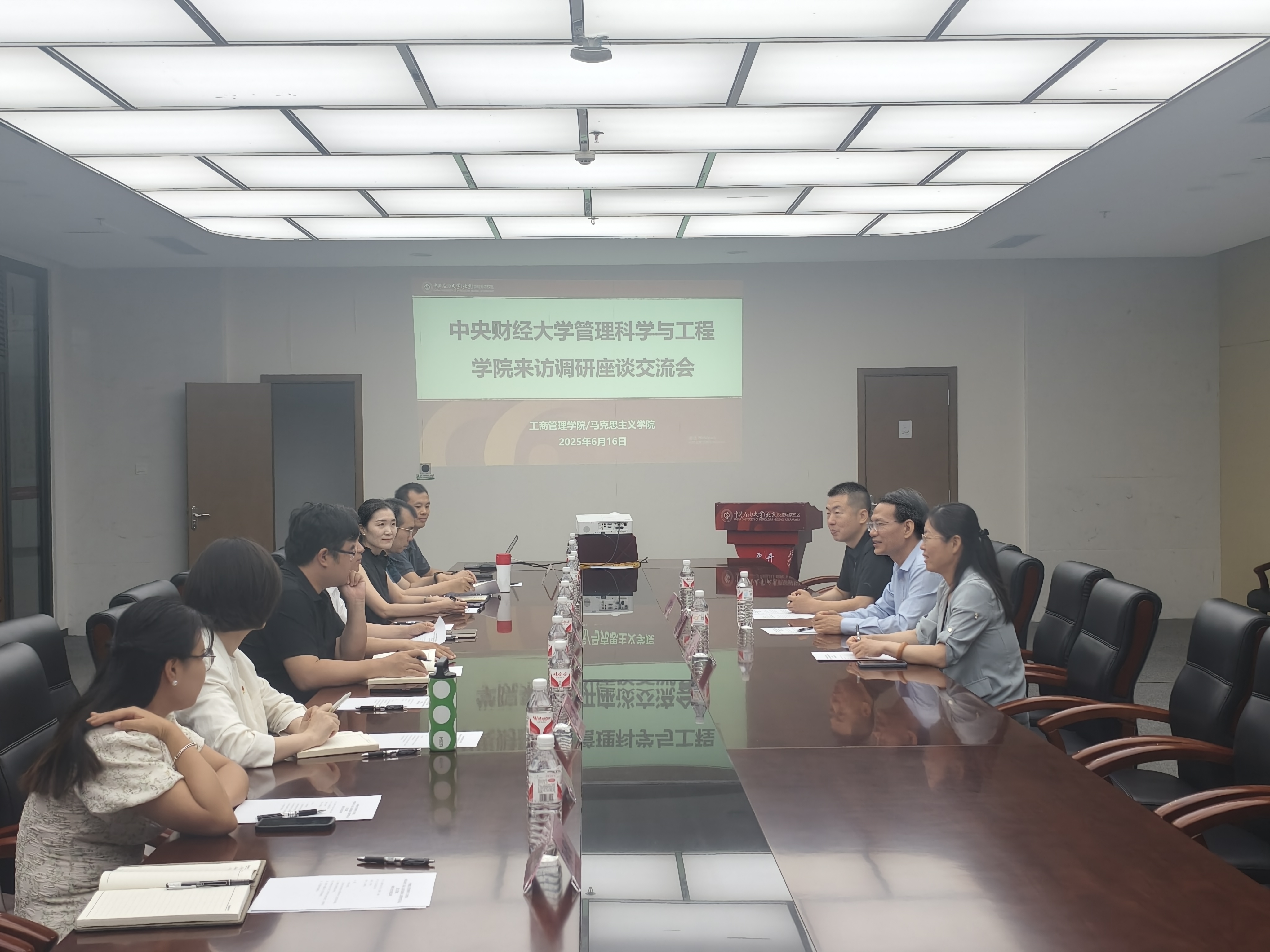 6月16日上午,双方在J2楼202会议室举行座谈与合作交流会。会议由学院党委书记刘焕礼主持。王志锋书记介绍了中央财经大学管理科学与工程学院的基本情况与办学理念,副院长荆中博围绕“大数据英才班”与“投资学+大数据双学士”人才培养模式作了详细介绍。