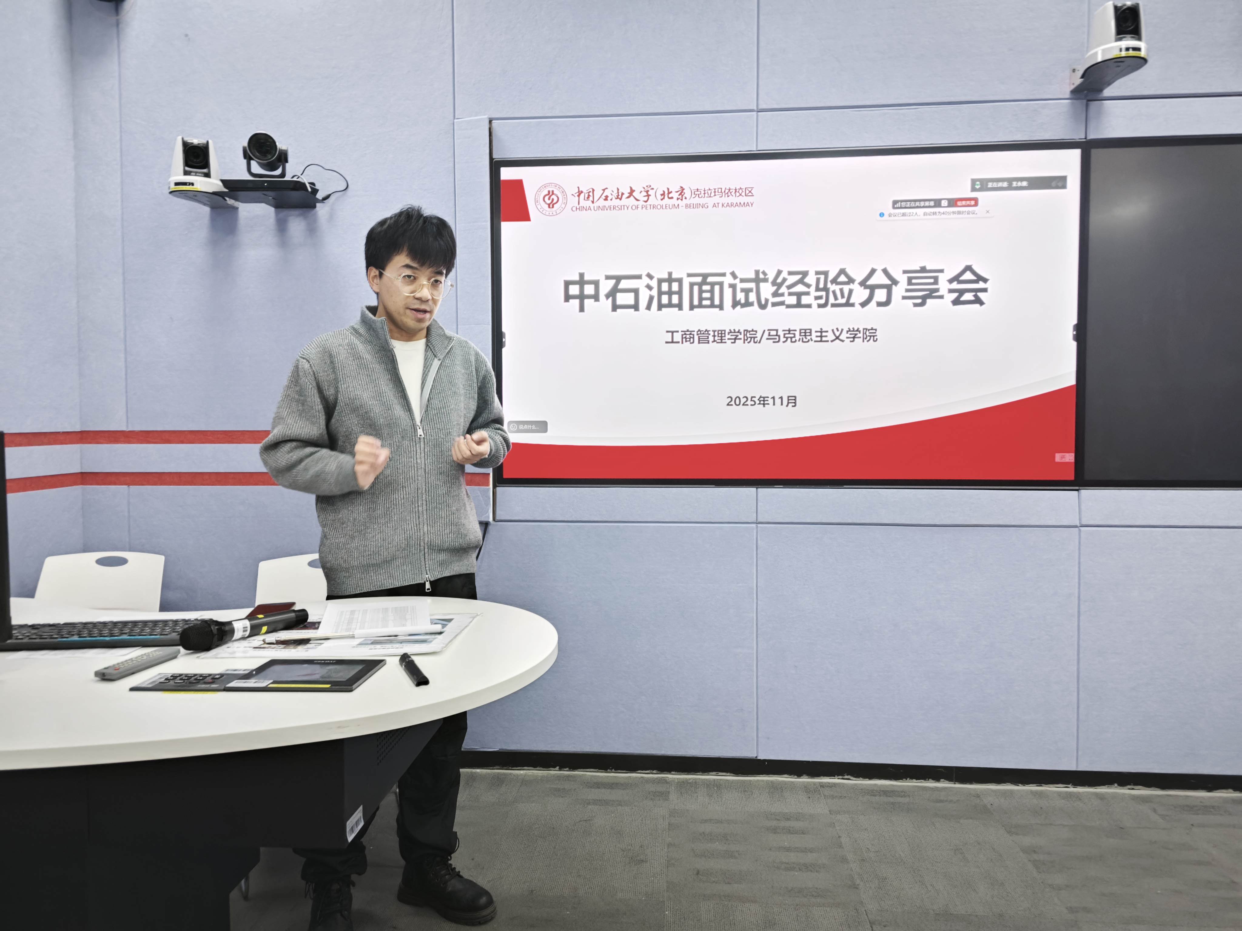为帮助2026届学子熟悉中石油面试流程,提升求职竞争力,11月16日下午工商管理学院/马克思主义学院在J2智慧教室召开中石油面试经验分享会。已入职中石油的往届学长孙海洋、范希志线下到场分享,李梓嘉以线上形式参与,学院20余名报考中石油毕业生到场参与。
