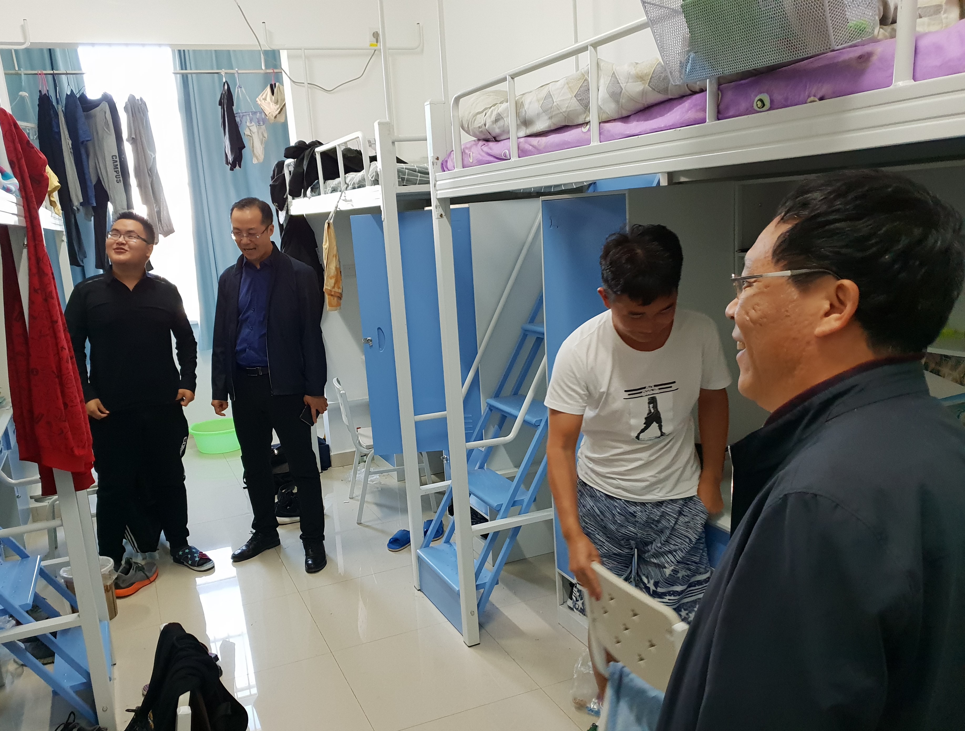 9月14日下午,石油学院院长谢庆宾带领全院班主任、辅导员深入学生宿舍看望走访学生,协助新生班主任了解学生住宿情况,并就宿舍可能存在的安全隐患及卫生状况进行了突击检查。
