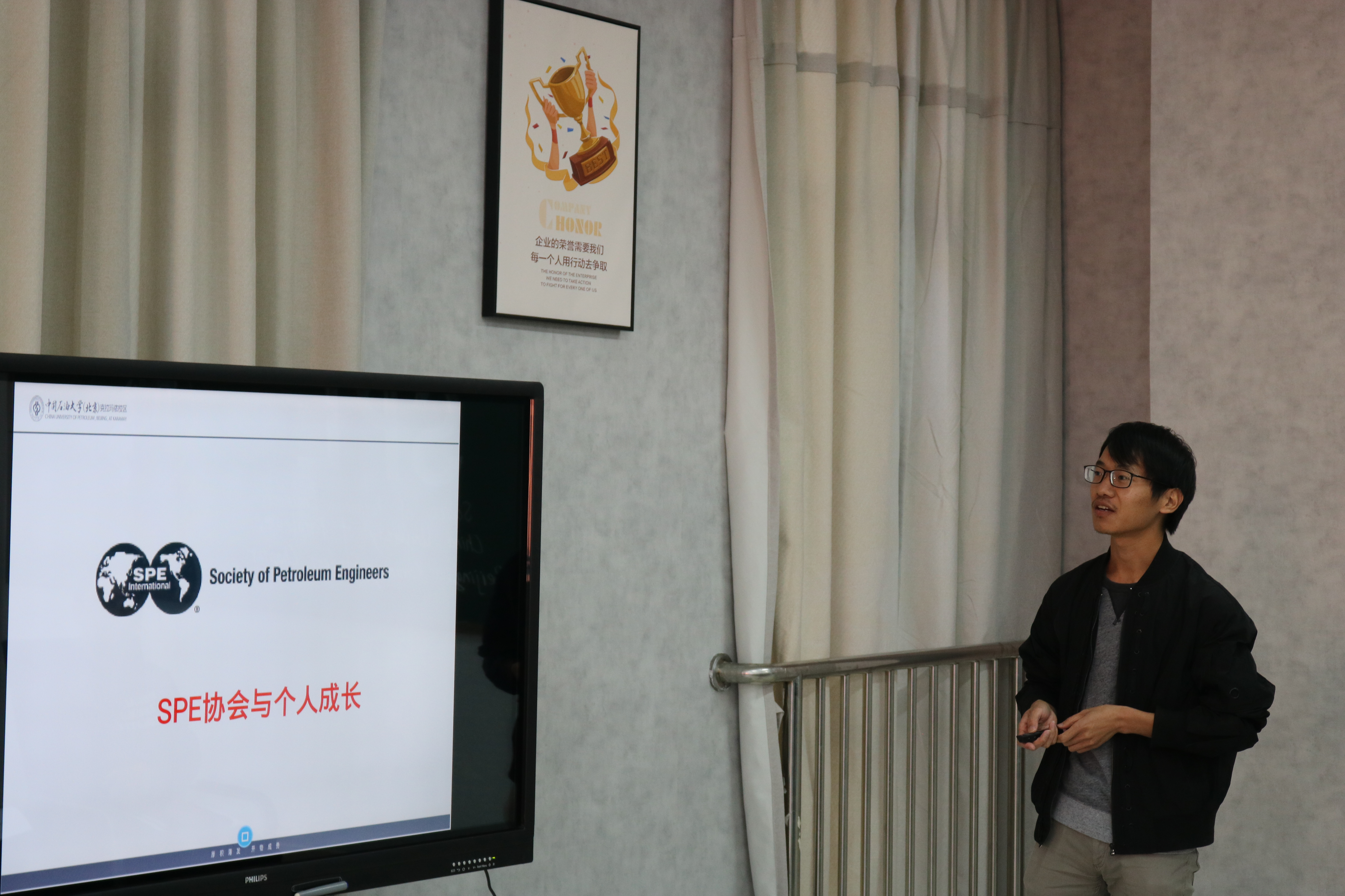 首先,校区SPE学生分会负责人孙照伟同学就分会成立背景、创办目的、创办意义及分会活动计划等多个方面进行详细的讲解,并将自己的工作设想积极主动地向到场师生生动表达,并号召热爱石油行业的同学们积极主动地融入到SPE的大家庭中来,为校区石油工程系建设、祖国石油行业发展做出自己的一份努力。