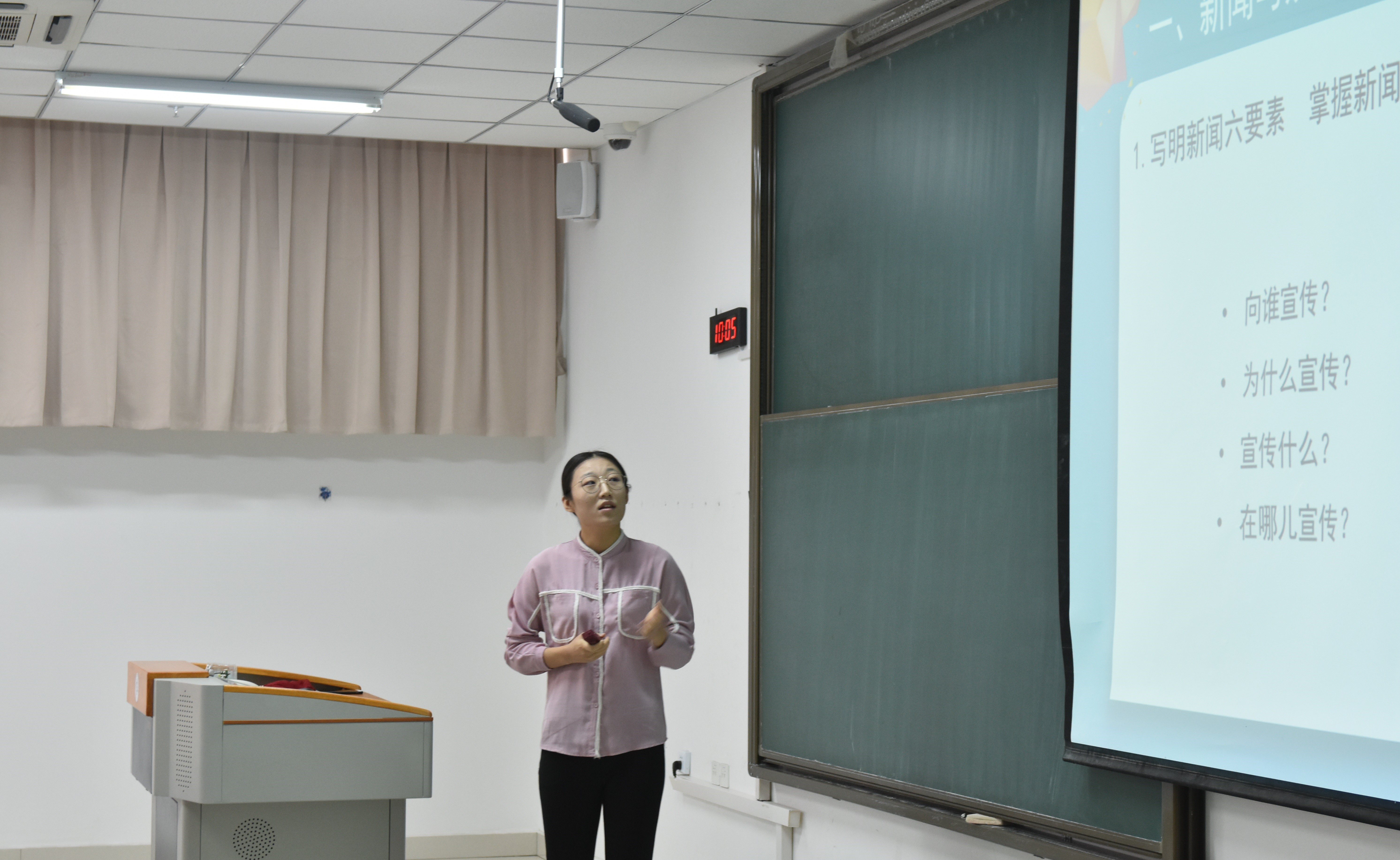 袁丽霞在培训中首先为同学们介绍了新媒体在当代社会中的重要性,强调新闻作为信息传播的重要载体,其对新媒体部门工作的重要意义,又从新闻分类、采写准备、要素结构、写作规范等方面作出了详细的讲解。随后在推文排版的培训中,通过回顾往期的问题推文案例,指出其中的错误及不当之处,为各部门成员进行了详细认真的讲解。同时强调,推文的写作与排版要抓住重点,有自己的想法观点,不要生搬硬套模板,这样才能做出一篇美观精致的推文。