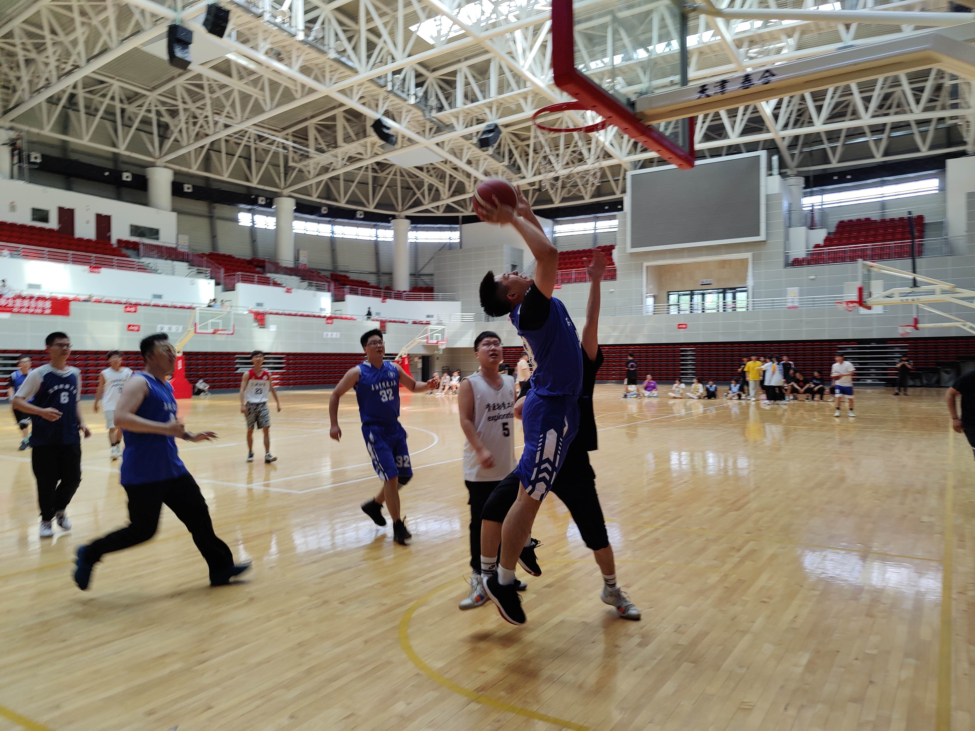 篮球场上,运动员们精神饱满,展现出了精湛的球技。师生同场竞技、各施所长,进攻、防守、配合,灵活迅速的运球变向、帅气精准的投篮纷纷呈现,引得现场观众为比赛呐喊助威。