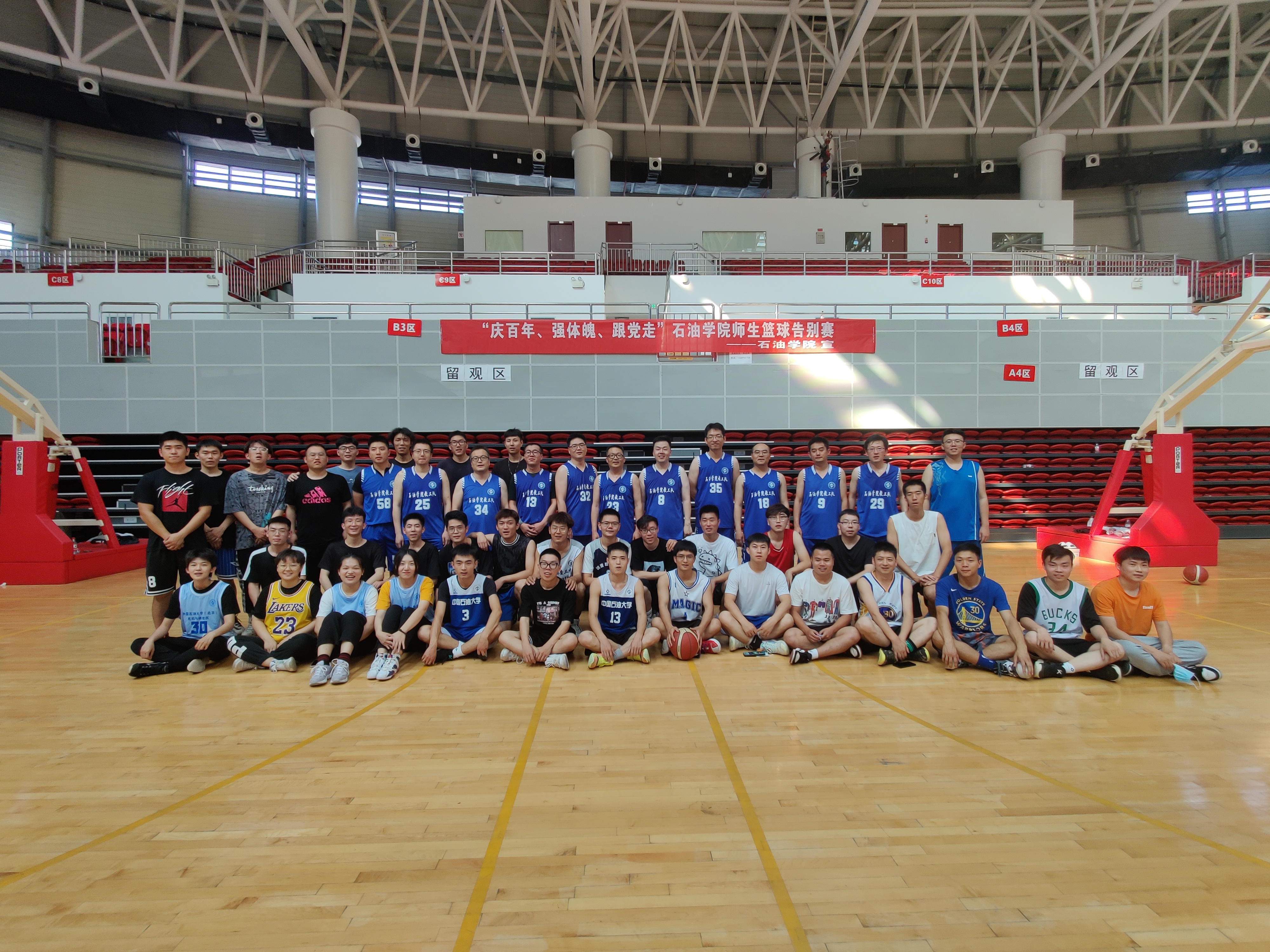 为欢送2021届毕业的毕业生,增进师生间情谊, 6月13日,校区石油学院在红山湖体育馆举行“庆百年、强体魄、跟党走”2021年毕业季师生篮球告别赛。石油学院教职工篮球队与石油工程、资源勘查工程、软件工程专业毕业生共同参赛。