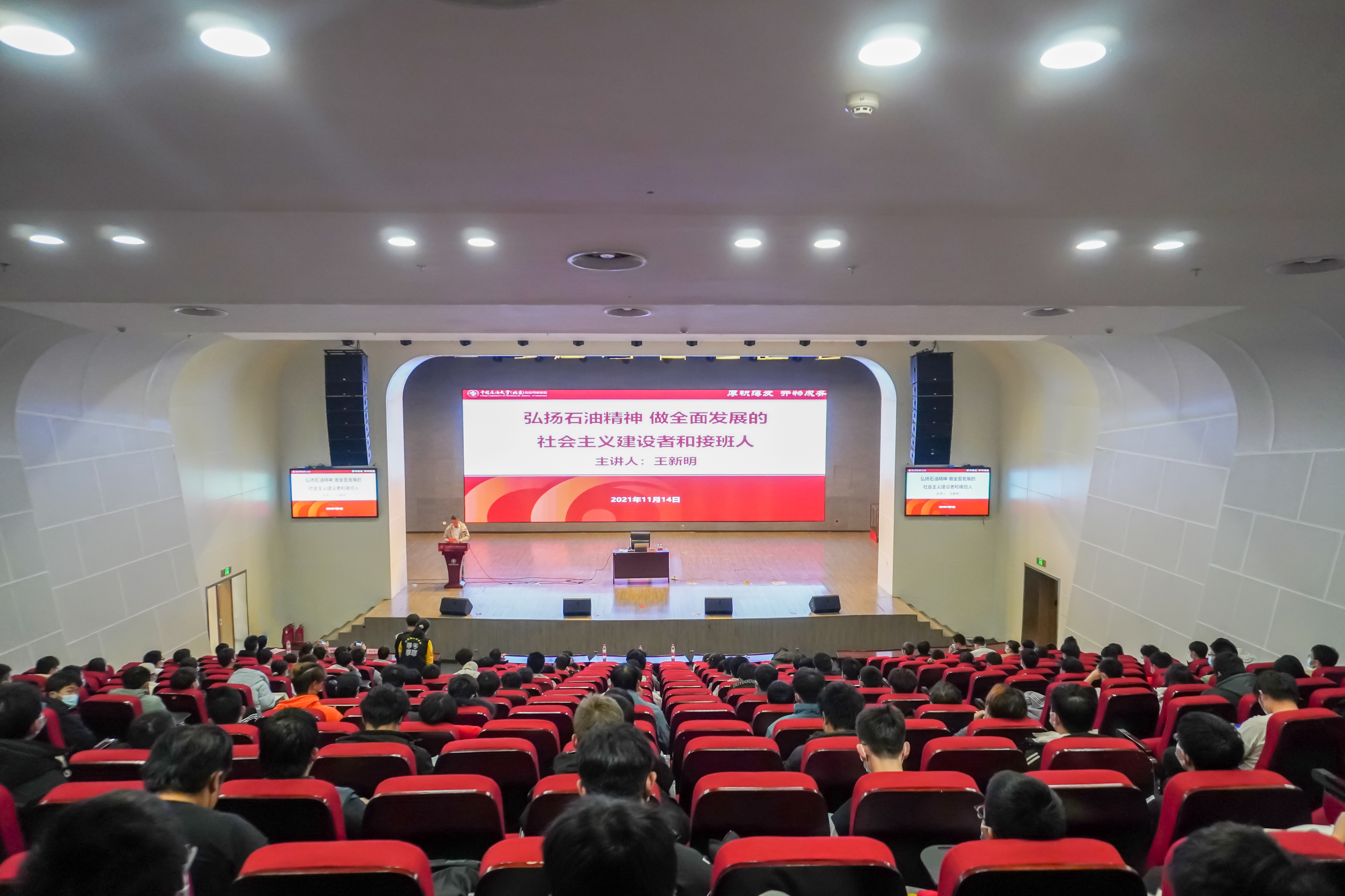 为深入推进文化润疆工程,传承克拉玛依城市文化,感悟石油精神,汲取奋进力量,2021年11月14日,石油学院于J2报告厅举行“培胡杨根,聚中华情,铸石油魂”文化润疆进校园城市文化宣讲活动。克拉玛依市关心下一代工作委员会主任、高级经济师王新明受邀作了题为《弘扬石油精神,做全面发展的社会主义建设者和接班人》的专题讲座。本次讲座由石油学院副院长穆总结主持,石油学院百余名师生到场聆听。