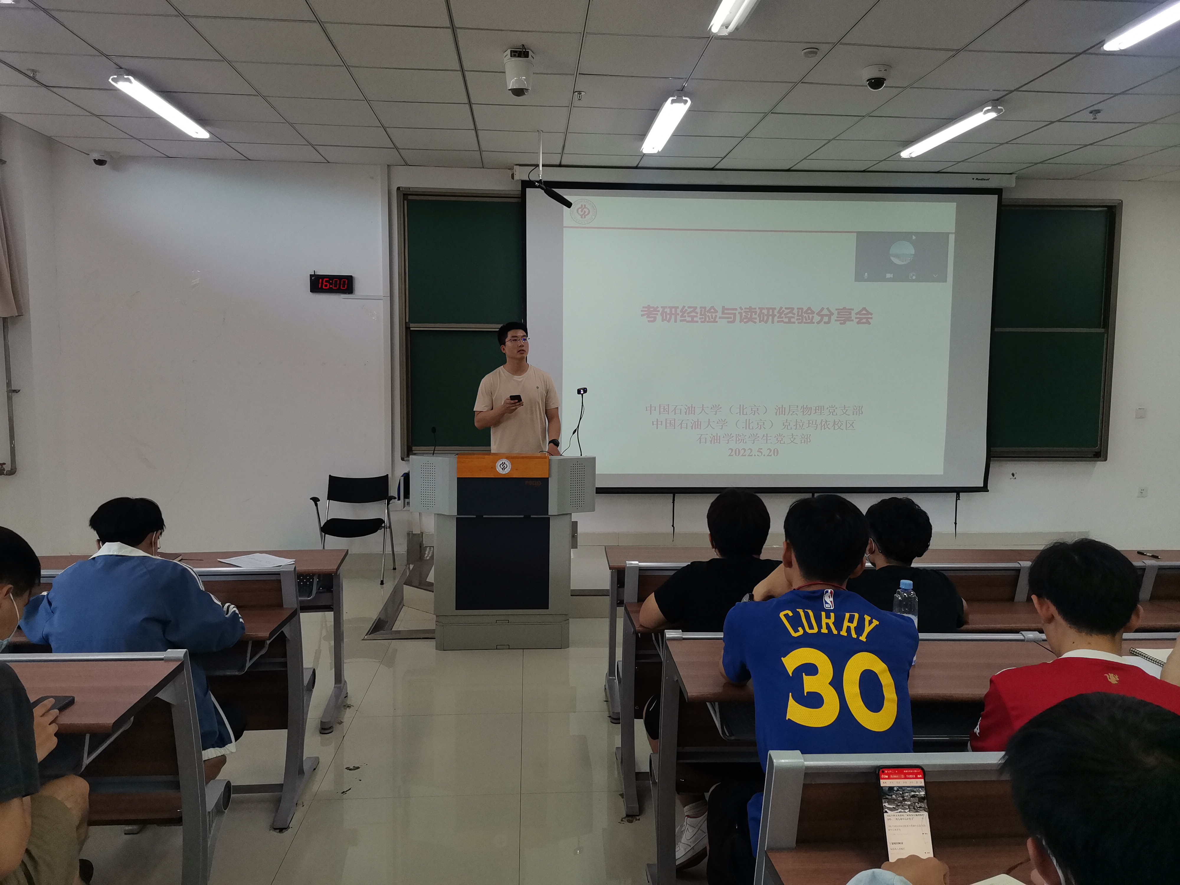交流会伊始,油层物理党支部书记吴建邦简单介绍了油层物理党支部的基本情况。之后校区首届毕业生高鑫远向大家分享了研究生报考过程以及读研经验,并详细的向石油工程专业学子分享了如何选择导师及专业方向,为大家选择学校以及专业提供了详细的信息。最后2020届油气田开发工程董文钢(专业考研408分,专业第一)向大家分享了考研准备过程,给准备考研的同学提出了几个重要建议,希望大家能够在考研期间做好准备,不半途而废,并且给大家提供了考研中关键时间的总结、考研各个科目的准备时间和复习思路、考研作息等宝贵经验。分享会后三位学长对大家提出的问题进行了详细的解答。
