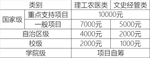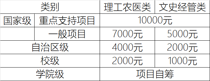 各类项目资助金额标准见下表,项目经费仅用作项目组学生开展研究使用,鼓励各学院自筹资金配套支持。