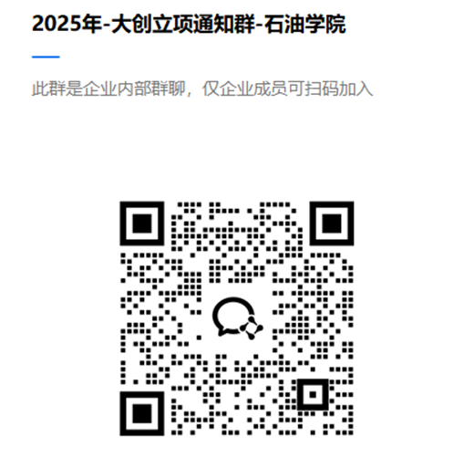 请申报的同学,企业微信扫码,加入【2025年-大创立项通知群-石油学院】,立项工作相关通知将在群内进行通知。