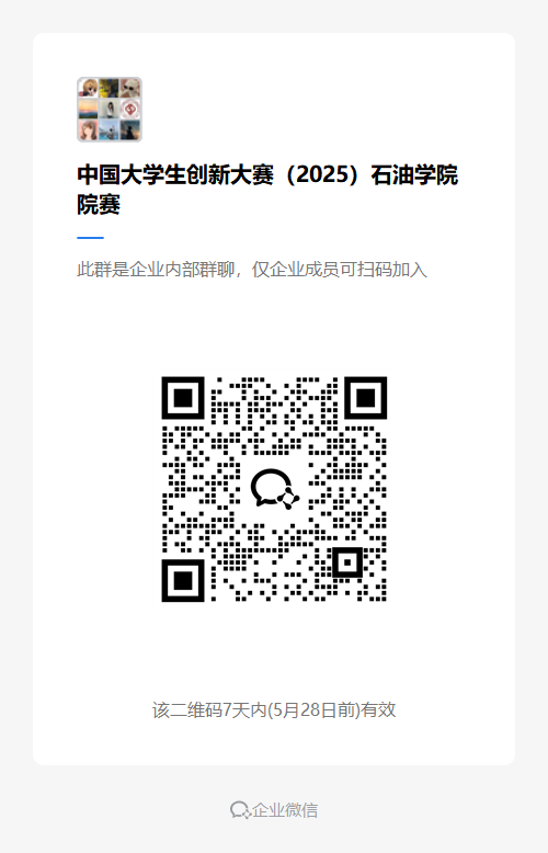 项目负责人请加入“中国大学生创新大赛(2025)石油学院院赛”企业微信群(如群二维码失效,请企业微信联系张孟凡老师)。