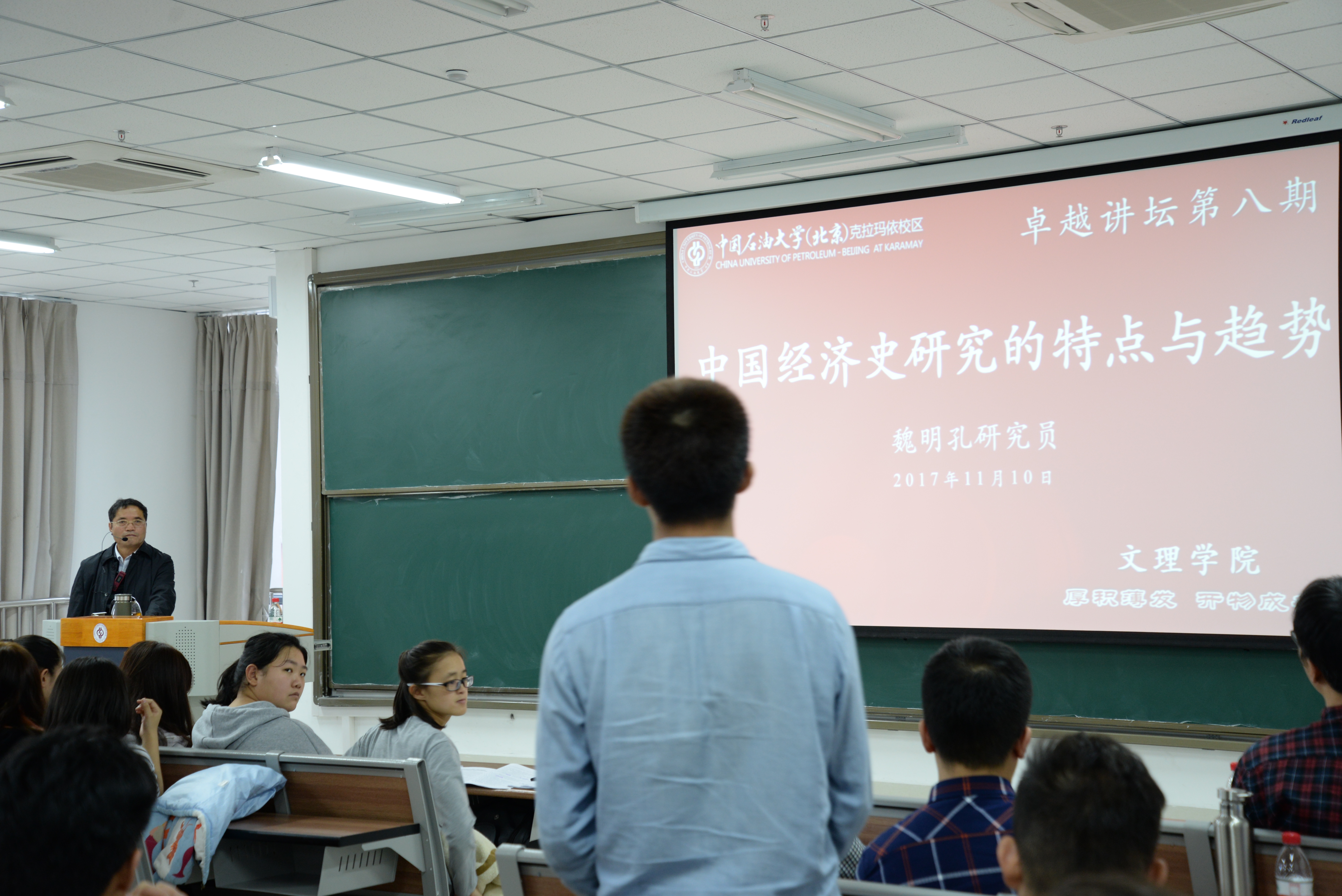 11月10日,中国石油大学(北京)克拉玛依校区文理学院第八期卓越讲坛在C5楼I区301成功举行。中国社会科学院经济研究所魏明孔研究员为同学们带来了主题为《中国经济史研究的特点和趋势》的精彩报告。文理学院专职副书记徐长亮、副院长宋飞、思政系主任张新国、历史教师张子青以及文理学院120余名学生参加了本期讲坛,讲坛由文理学院副院长屈满学主持。