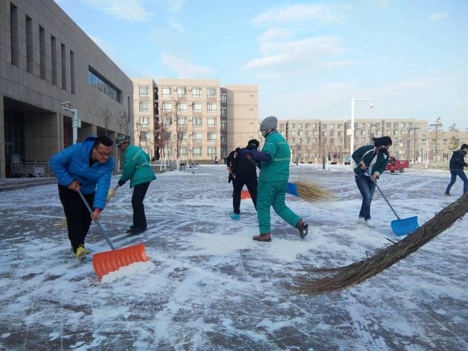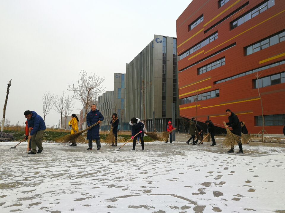 12月11日中午,文理学院工会小组也组织教职工志愿者们在休息之余拿起工具,到教学楼前清理道路上的积雪。随着一条条宽阔的路面被清理出来,美丽的校园又多了一份整洁。