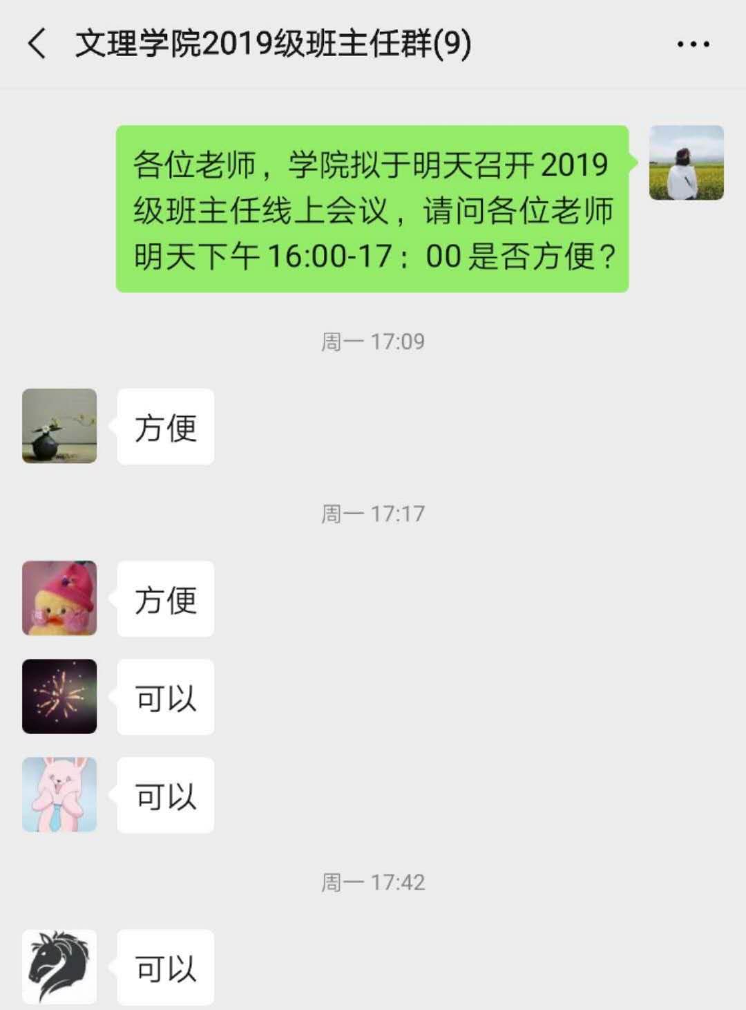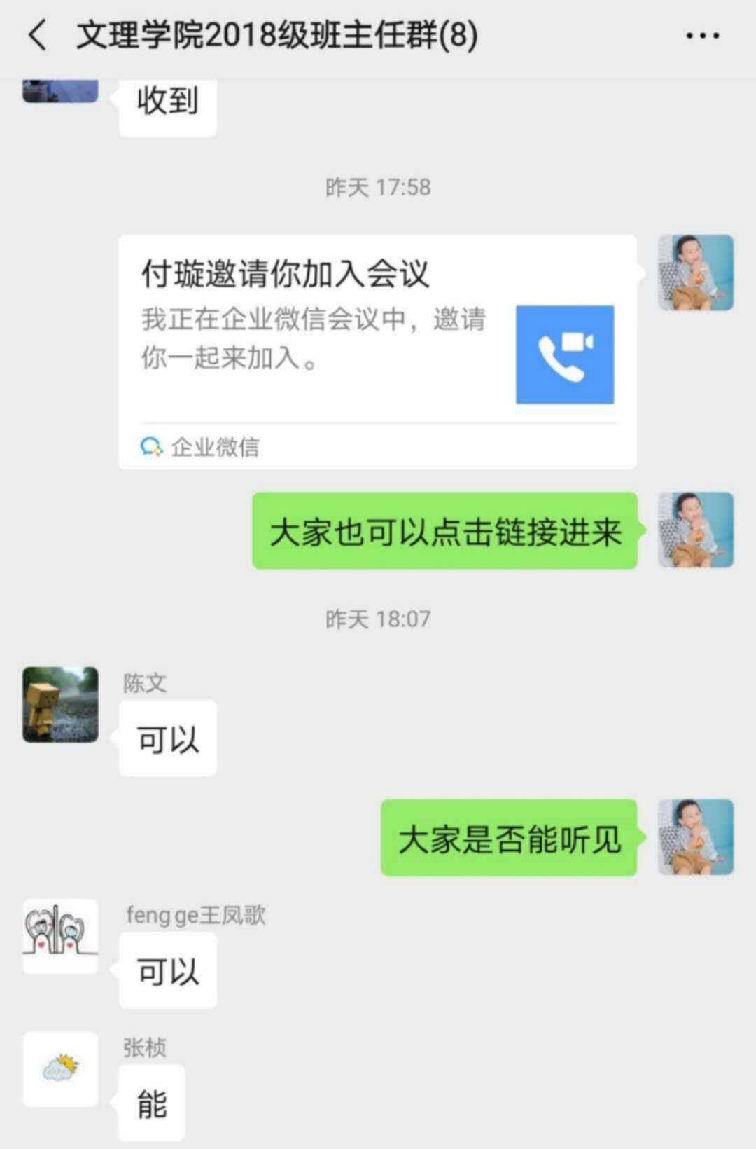 特殊时期,学生延期返校,网课已全面开课,新学期正式开始,2020年3月2日,文理学院通过网络平台分别召开新学期辅导员例会和分年级班主任例会,对新学期学院学生工作进行研究部署。学院专职副书记徐长亮、团总支书记付璇,辅导员王均涛、袁亚婷,助管杜旭及全体班主任老师参加了会议。