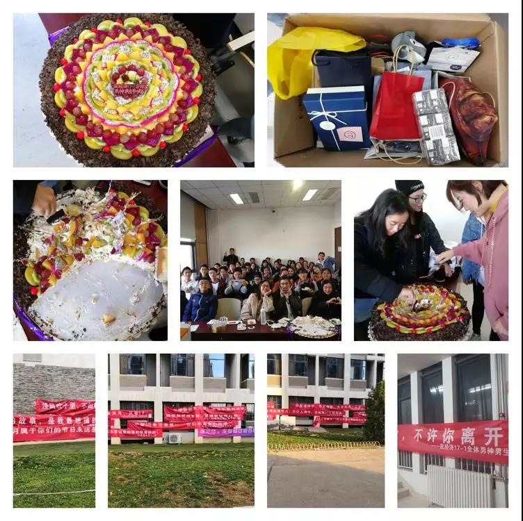男生节前一天晚上,我们班女生悄悄潜入男生宿舍大厅里贴了“只许州官放火,不许你离开我”的土味情话横幅,还精心制作了祝福视频,悄悄买了超大size的蛋糕,给每个男生都准备了小礼物……