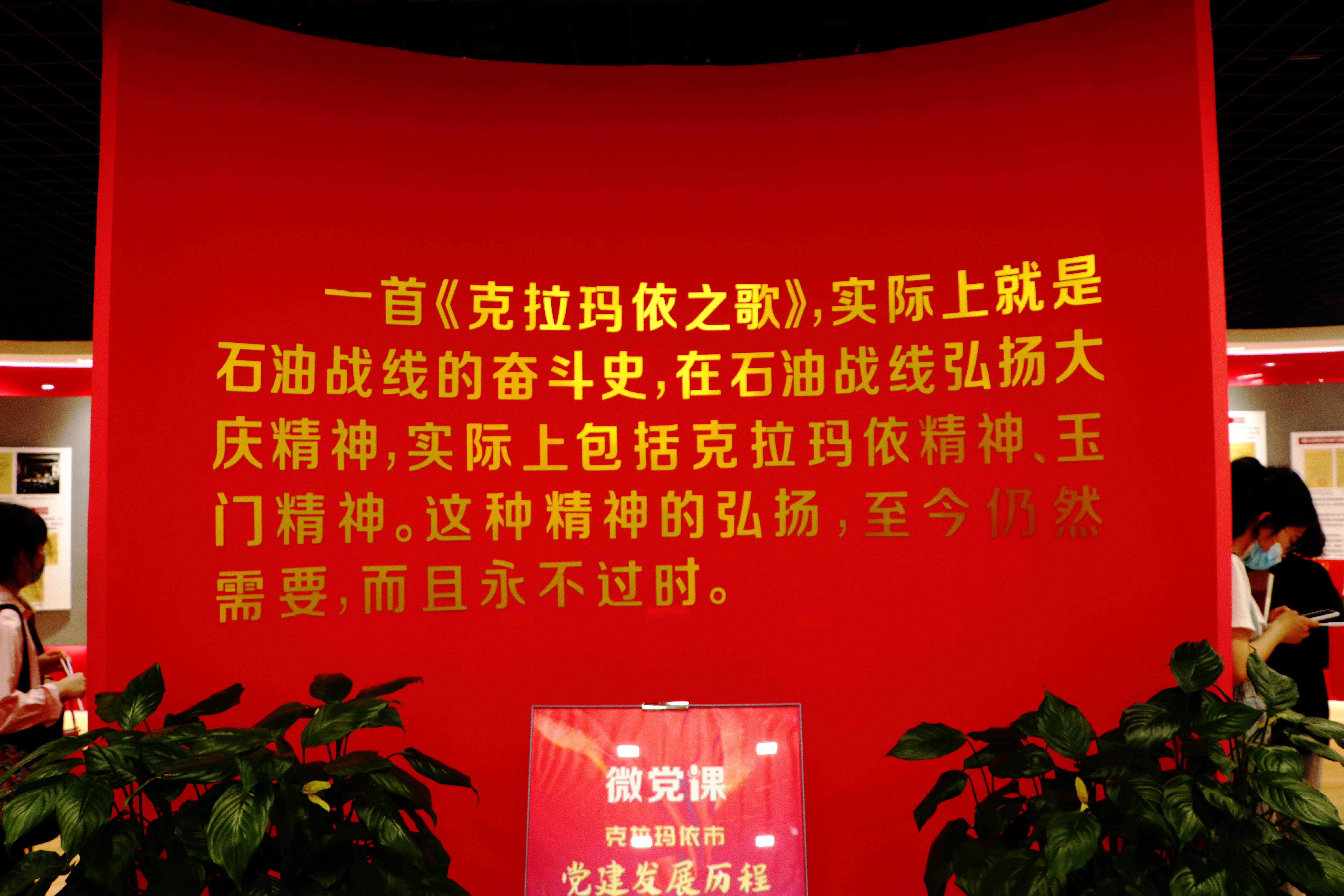 克拉玛依党群服务中心的工作人员以时间轴作为主线进行党史知识的讲解。以独山子油矿作为开篇,详细介绍在抗日战争爆发后,中共党员和爱国人士以不同身份、不同形式关怀独山子油矿;再从建立基层党组织,到正式成立中共新疆石油管理局、克拉玛依市委员会,结合英雄事例,见证第一代石油人克服重重艰难险阻,在风沙肆虐、草木不生、缺水少水的亘古荒原上建立起新中国第一个大油田;最后,迎着十一届三中全会的春风,克拉玛依鼓起了社会主义现代化建设的风帆,踏上了全面推进改革开放、实现城市油田快速发展的新征程。