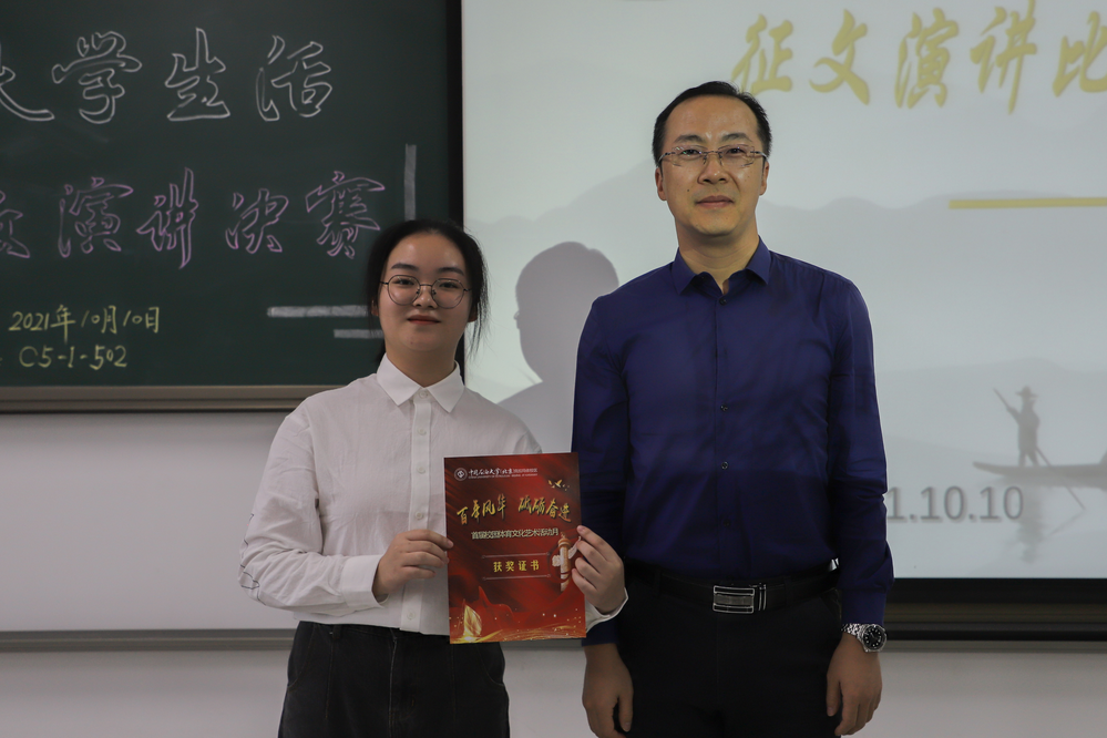10月10日,“启航·我的大学生活”新生征文演讲比赛决赛落下帷幕。来自校区各学院的10名决赛选手在舞台上分享了自己的大学生活,既有对远方家人的思念和对大学生活的憧憬,也有对西北辽阔疆域的感叹和对人生理想的奋力追逐。伴随着悠扬的音乐、生动的语言和精美的图片,选手们讲述了他们在红山湖畔、图书馆里学习生活的故事,表达了在习近平总书记回信精神的鼓舞下坚定了“到祖国需要的地方去”的理想信念。慷慨激昂的陈词、激情四射的演讲,让在场的观众深切地感受到了新生们对知识的渴望、对校园的热爱以及勇担时代使命的责任与担当。经过近两个小时的比赛,最终来自工商管理学院/马克思主义学院行政管理专业的郭紫璇同学获得此次比赛一等奖。文理学院院长殷文教授为获奖选手颁奖。