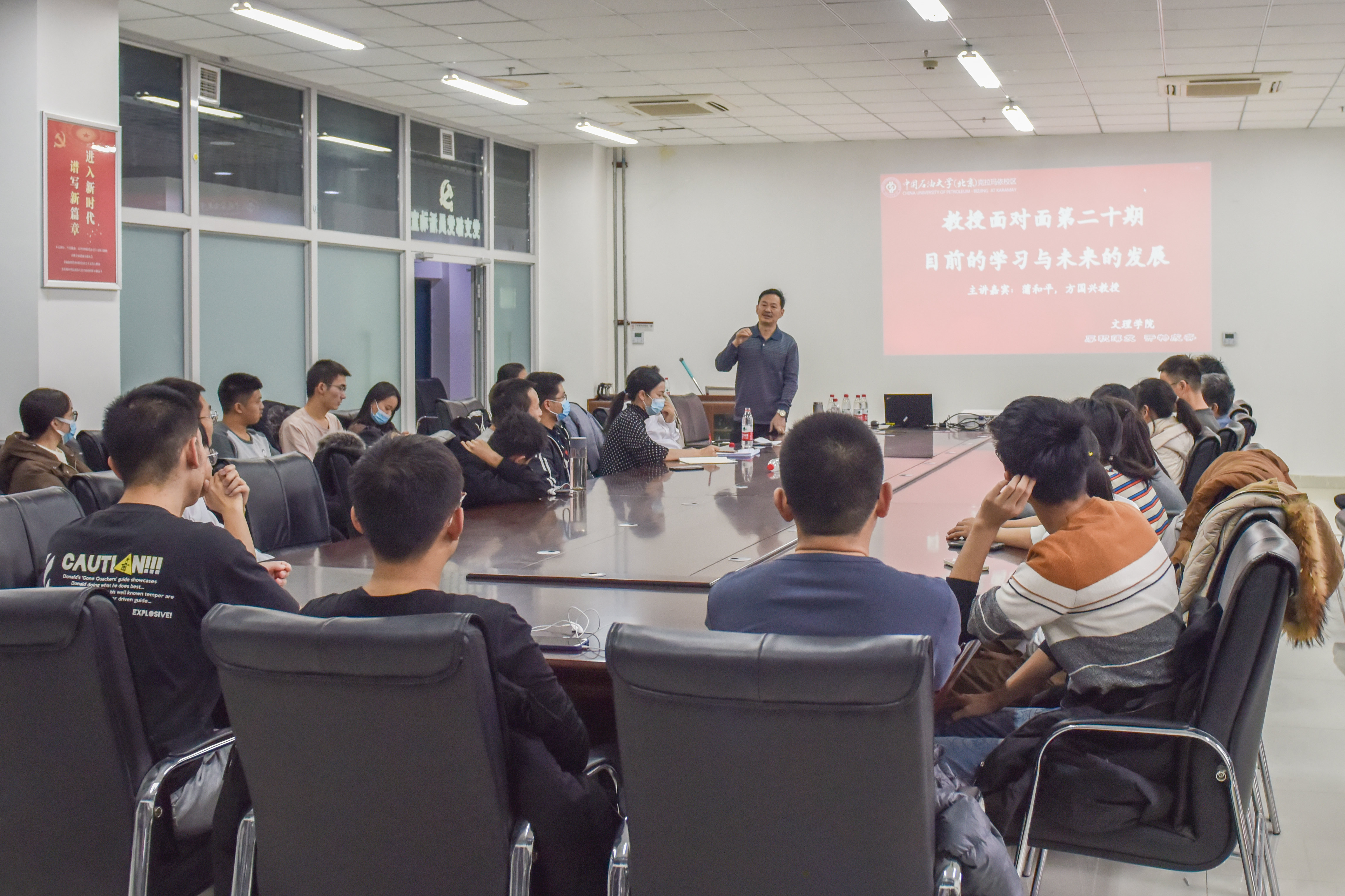 11月5日下午,文理学院在C5崇文楼举办了第二十期教授面对面活动。电子科技大学银铃教师蒲和平教授、对外经济贸易大学银龄教师方国兴副教授受邀与学生进行了主题为《目前的学习与未来的发展》的专题交流。文理学院统计学专业21级30余名新生及数学系部分教师到场聆听交流,本次活动由文理学院数学系副主任周瑜主持。