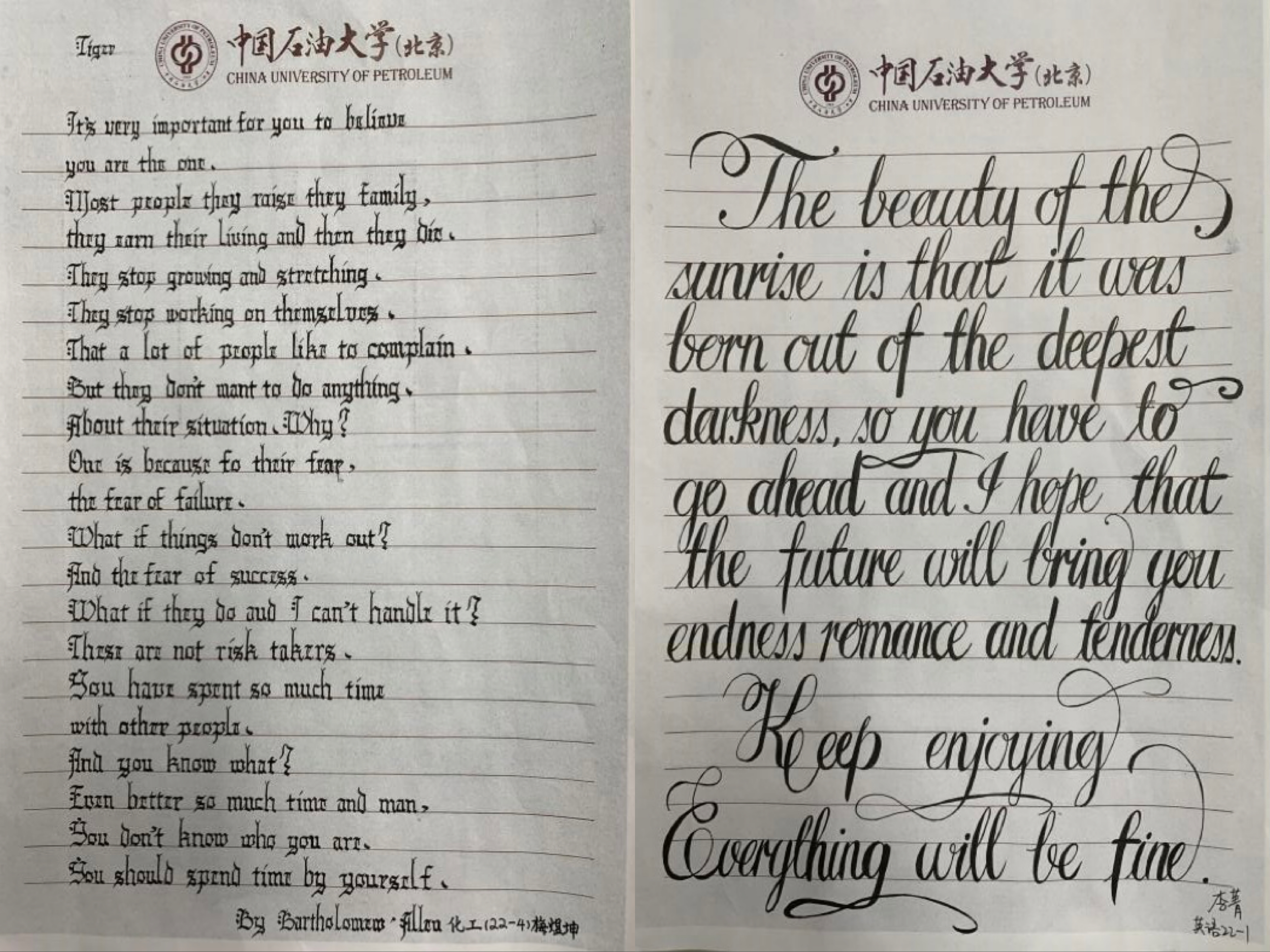 英文书法比赛将作为我校学生外语学习的特色竞赛传承下去,也将作为我校外语系外语特色文化的重要组成部分,积极为促进和提升校区大学英语及英语专业学生的学习氛围助力添彩。