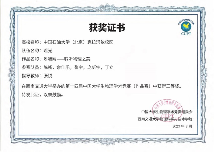 本届比赛由来自华东、华北、东北、西北、中南、西南等全国六大赛区486支队伍经过激烈竞赛后推荐产生。为在本次大赛上取得好成绩,文理学院物理系在3月份组织了竞赛宣讲活动,让校区同学们更细致的了解竞赛题目,竞赛规则。物理系教师成立竞赛指导小组,并于5月举办了校区选拔赛,最终由职海杰、陈涛涛两人组成的“CUPK”队和由陈畅、余佳乐、张宇、庞新宇、丁立五人组成的“瑶光”队脱颖而出,代表校区参加第十四届全国中国大学生物理学术竞赛(作品赛)。物理系将在新一年的赛事中认真筹备,合理安排,争取在竞赛获奖等级、获奖数量上取得进一步的突破。