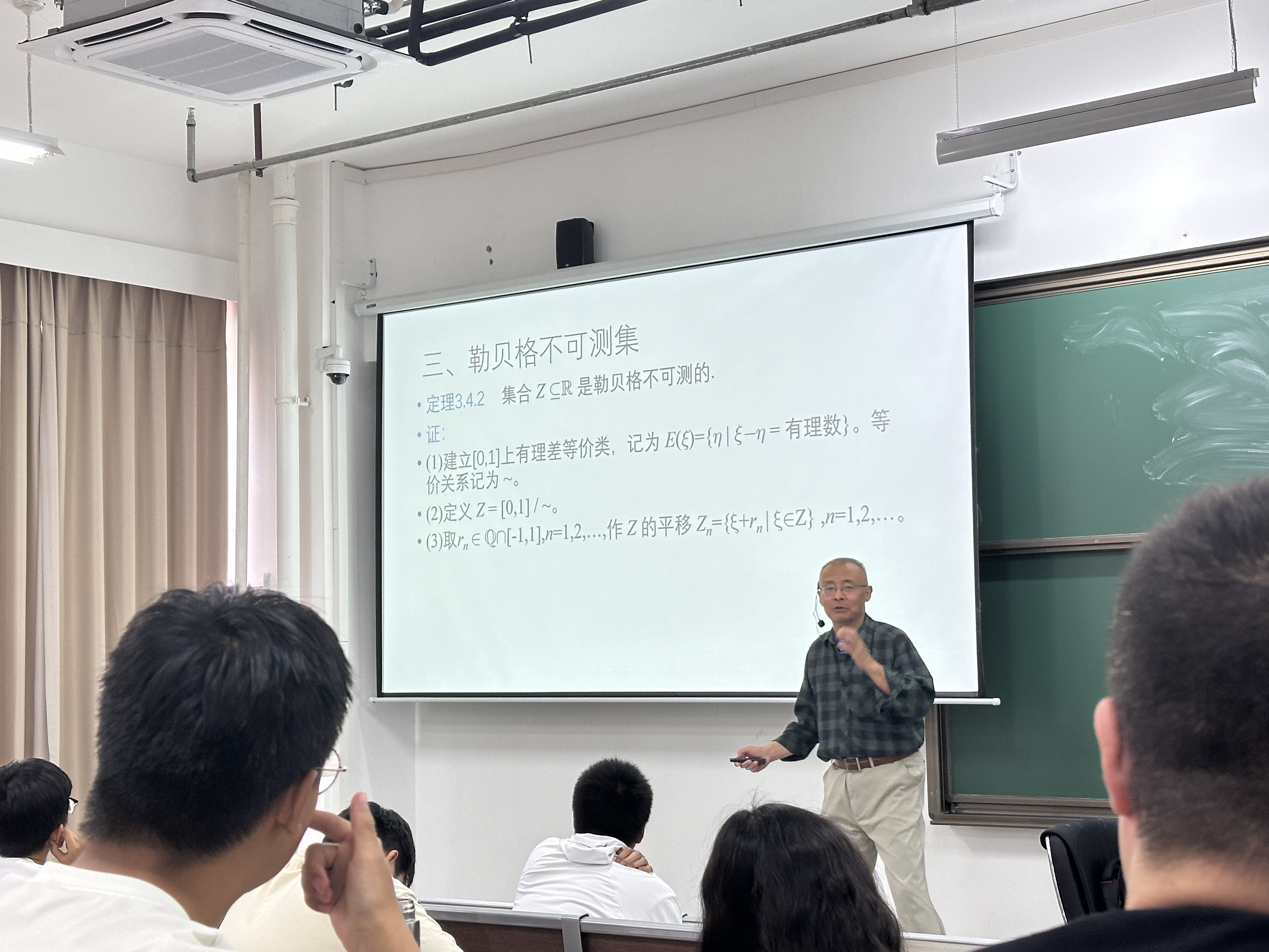 刘老师首先带领大家学习了零测集与可数集的基本概念,并通过康托集的实例,使大家深刻认识到零测集与可数集之间的区别。他利用PPT与板书相结合的方式,详细阐述了康托三分集的七个性质,让在场师生对这一概念有了更加全面深入的理解。随后,刘老师引入维塔利定理,详细讲解了勒贝格不可测集的构造思路,并对勒贝格测度的平移不变性进行了深入的证明。他深入浅出的讲解方式,不仅让在场师生对勒贝格不可测集有了清晰的认识,更激发了大家对数学研究的浓厚兴趣。