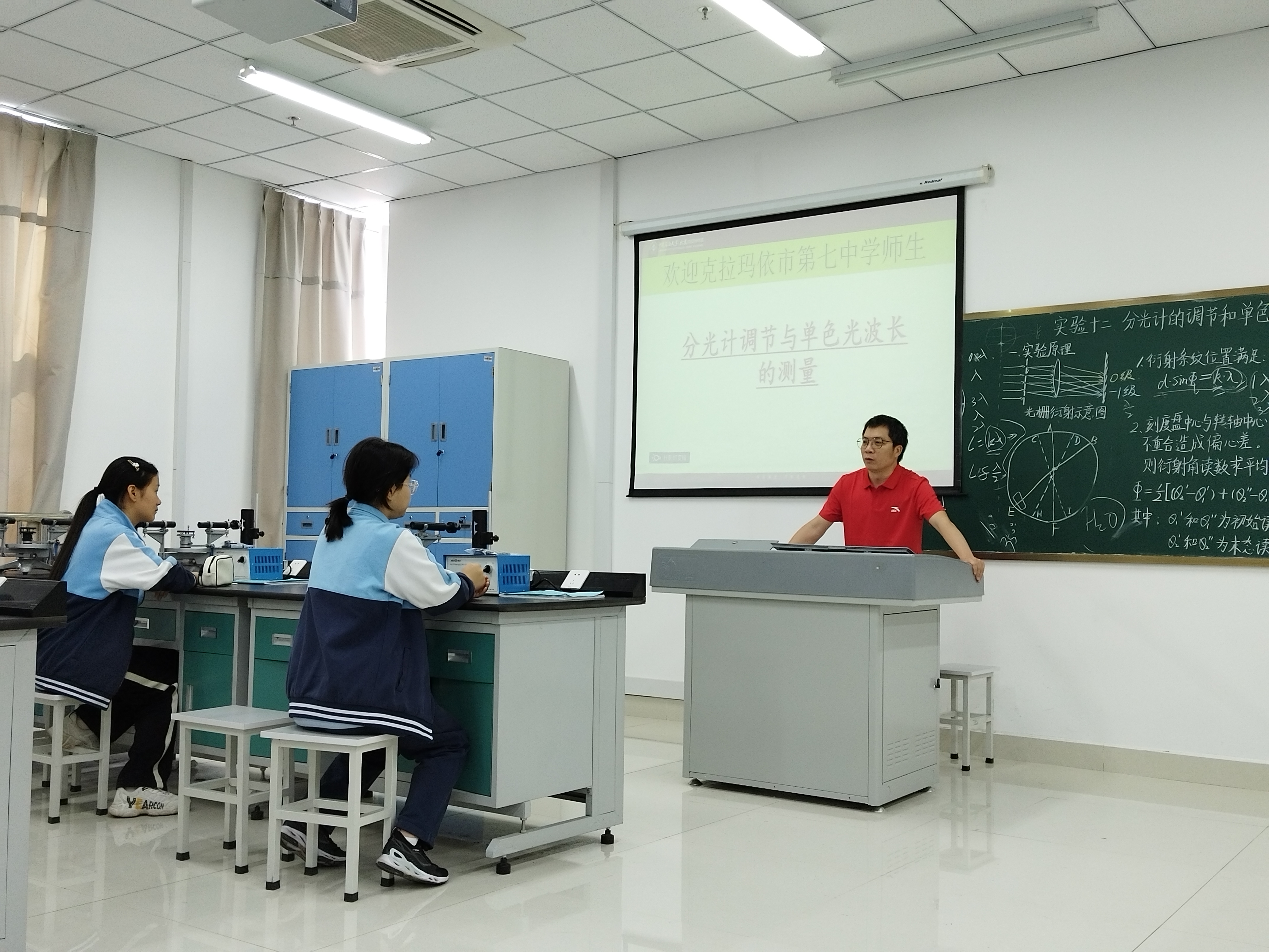 为进一步发挥自治区科普教育基地文化润疆的作用,积极响应克拉玛依市科技活动周的号召。5月31日,文理学院/文化艺术学院物理系与克拉玛依市七中联合开展了一场别开生面的科普教育活动。本次活动吸引了七中初二年级的众多学生参加,活动内容丰富多样,分为交互式实验体验和大学物理演示实验设备的观摩体验两部分。