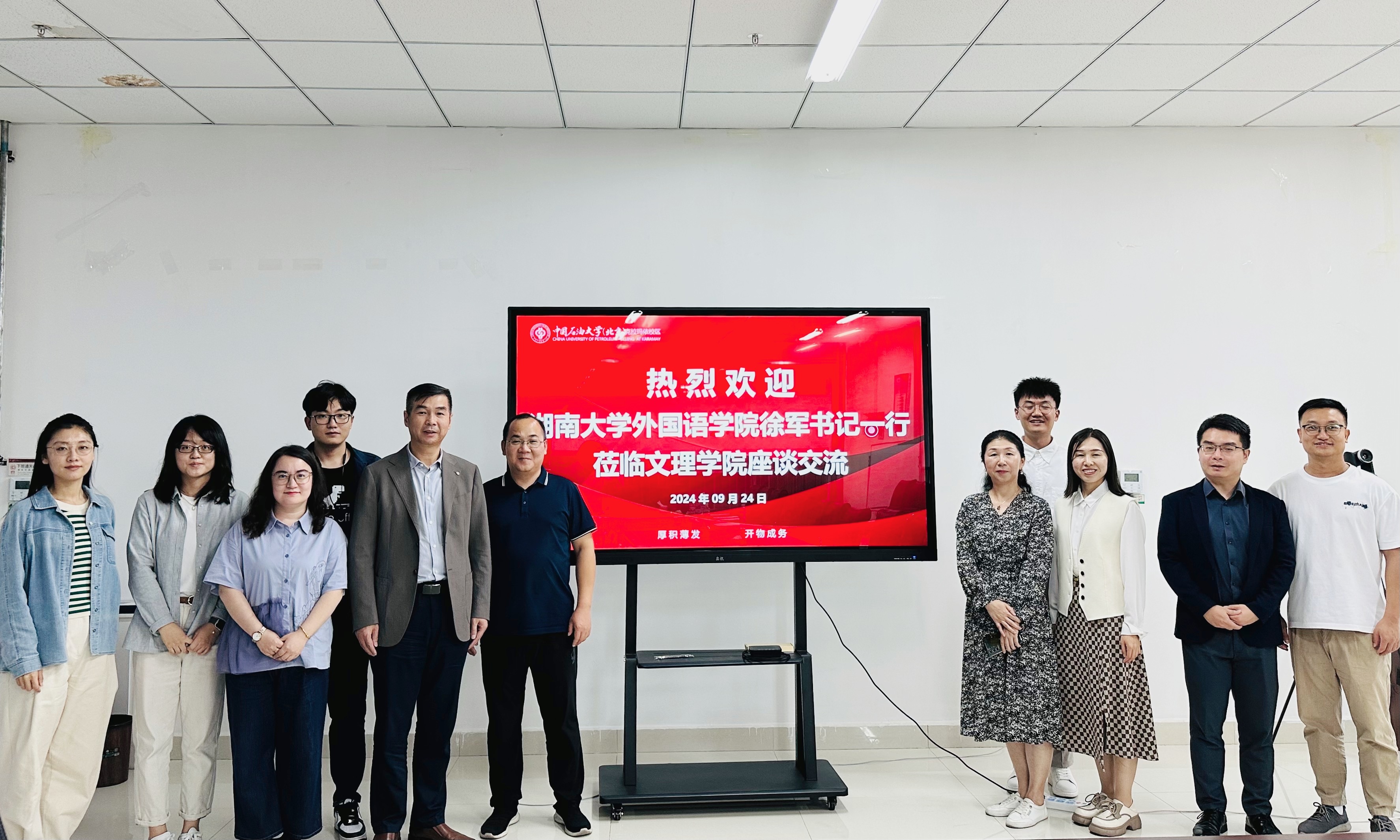 2024年9月24日,湖南大学外国语学院党委书记徐军、教授陈飞、曾涛,以及新疆师范大学外国语学院学术副校长阳志清教授一行到访校区文理学院/文化艺术学院座谈交流。学院党委书记何汉挺、校区合作发展部主任徐小芳、语言与艺术系教师代表参加了此次会议。