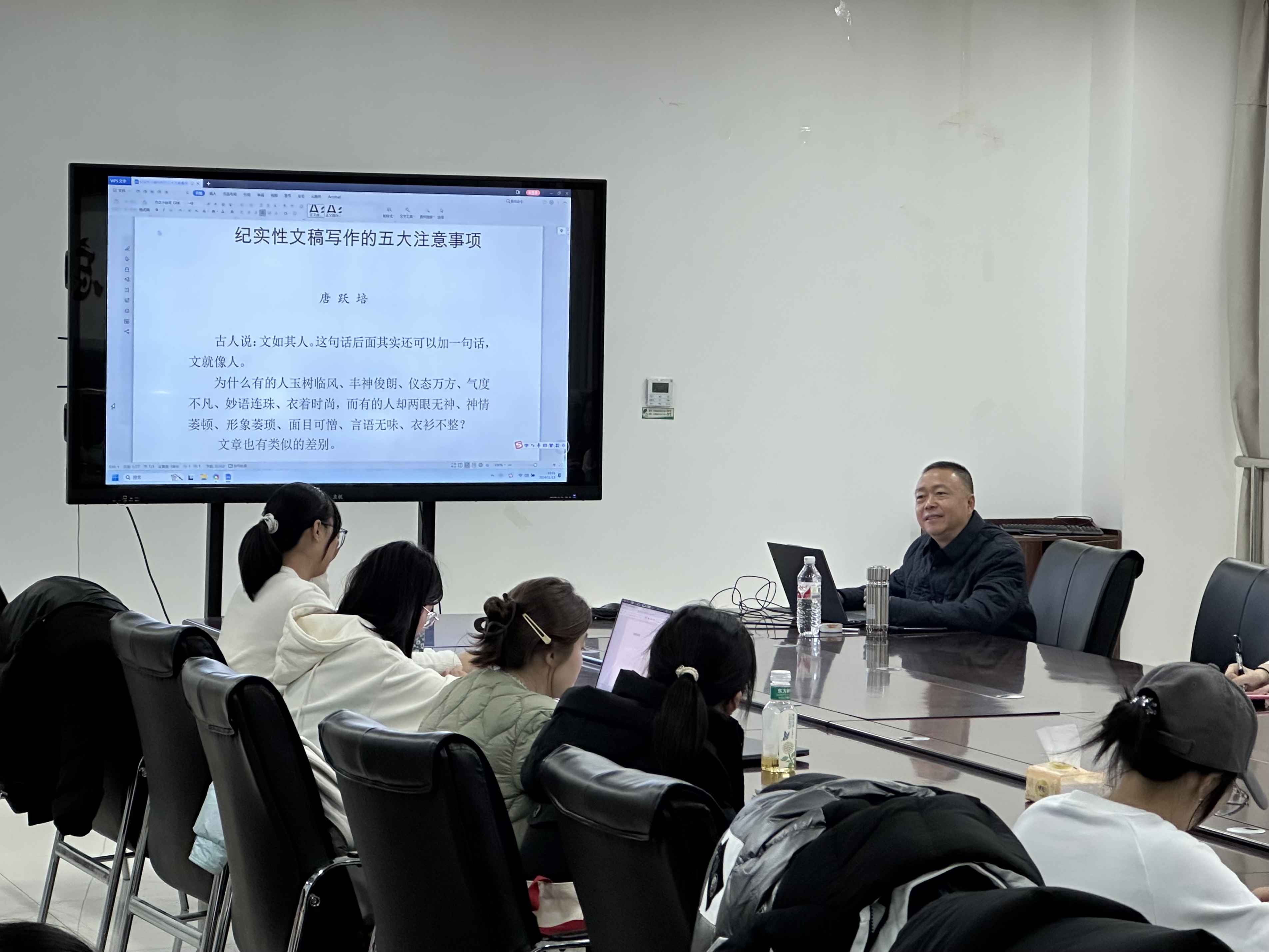11月13日,语言与艺术系邀请新疆“十佳新闻工作者”、克拉玛依日报社高级编辑唐跃培,为在校学生举办了一场题为《纪实性文稿写作的五大注意事项》的新闻宣传能力提升工作坊。活动吸引了来自汉语言文学、英语、俄语等多个专业的四十余名学子积极参与。