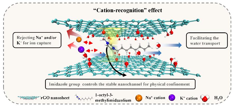 图 1. IL-rGO膜中二维纳米通道的“阳离子识别”概念示意图。在rGO纳米通道内,咪唑基团排斥Na+以及K+,吸引水分子。这些选择性相互作用确保Na+离子被有效截留,而水分子则以超高流量通过。