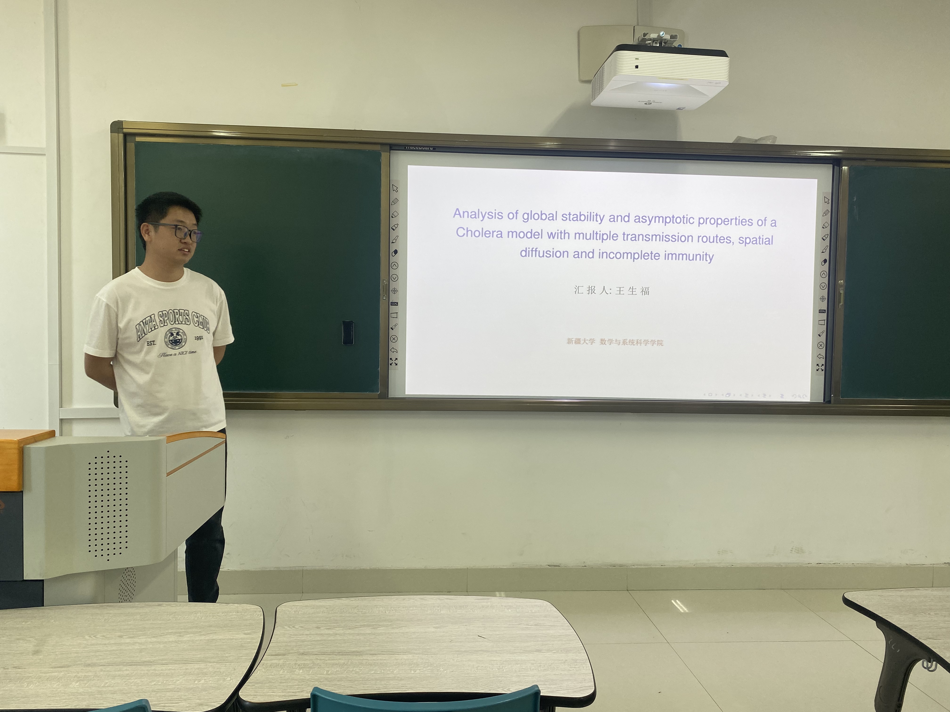 王生福为文理学院数学系教师作了题为 “具有多重传播途径、空间扩散及不完全免疫的霍乱模型的全局稳定性与渐近性态分析” 的学术报告。王博士深入浅出地讲解了该模型的构建及分析过程,展示了其在全局稳定性与渐近性态方面的前沿研究成果,拓宽了教师们的学术视野,为相关科研工作提供了有益借鉴。