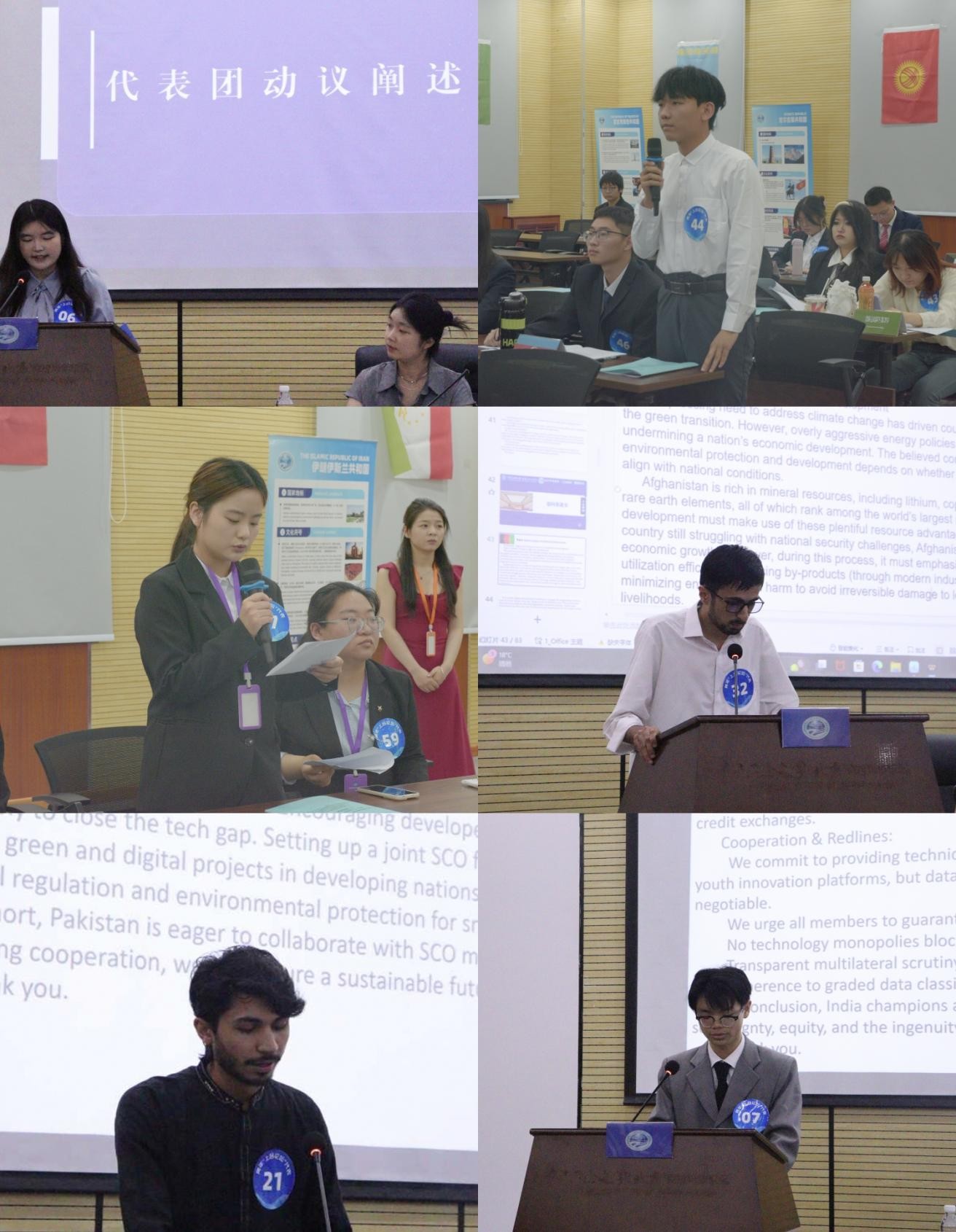 本次会议议程涵盖入场、开幕式、主议题演讲、自由提问、宣言表决及闭幕式等环节。来自校区的中外学生组成上合组织成员国、观察员国及对话伙伴国代表团,以“凝聚青年智慧,共话上合未来”为主题,聚焦“数字丝路与绿色转型:青年创新如何平衡上合国家的安全利益与发展诉求?”以英语、俄语、汉语为会议语言模拟国际谈判,展开外交磋商与辩论,并最终表决通过《青年联合宣言》。非正式成员国及模拟媒体组参与提问互动,通过多边谈判、提案起草等环节,全面锻炼学生的外交礼仪、双语表达与危机处理能力。