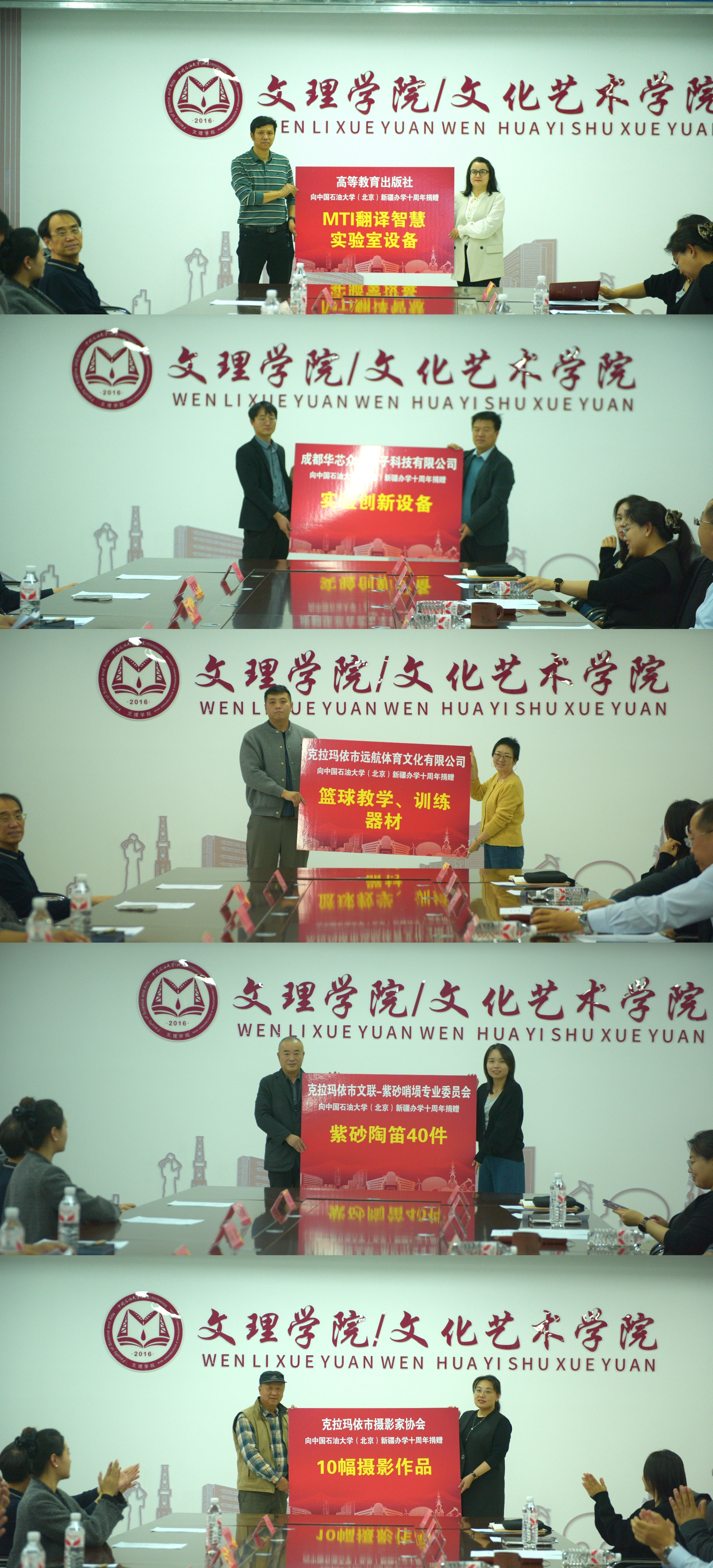 十载耕耘育桃李,砥砺奋进谱新篇。值此中国石油大学(北京)克拉玛依校区经教育部批复设立十周年之际,学院隆重举行捐赠仪式,共同见证社会各界对学院发展的深切关怀与鼎力支持。学院一共收到10余家企事业单位、协会及团体的支持与捐赠。参加捐赠仪式的代表有高等教育出版社、成都华芯众合电子科技有限公司、克拉玛依市远航体育有限公司、克拉玛依紫砂陶笛工作室、市摄影家协会。学院党委书记何汉廷、院长殷文、副院长杨妍、各系主任及教师代表参加,仪式由副院长杨妍主持。