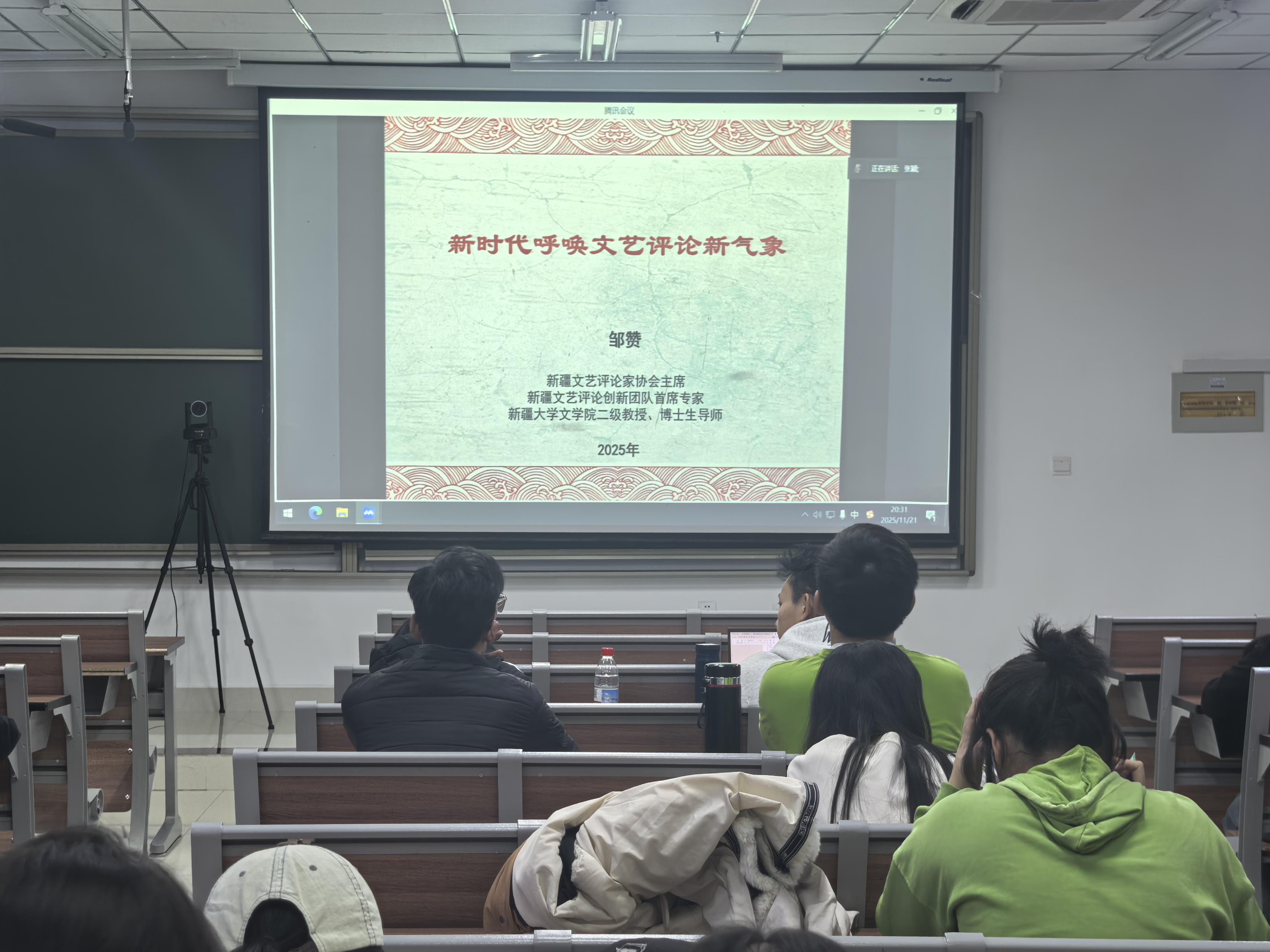 11月21日晚,文理学院/文化艺术学院汉语言文学专业特邀邹赞老师开展《新时代呼唤文艺评论新气象》专题讲座。邹赞老师毕业于北京大学中文系,文学博士、博士后,现为新疆大学二级教授、博士生导师、博士后合作导师,国家一流本科专业建设负责人,自治区“十四五〞优势学科带头人。此次讲座在C5楼I区202教室开展,共70余名师生参加。