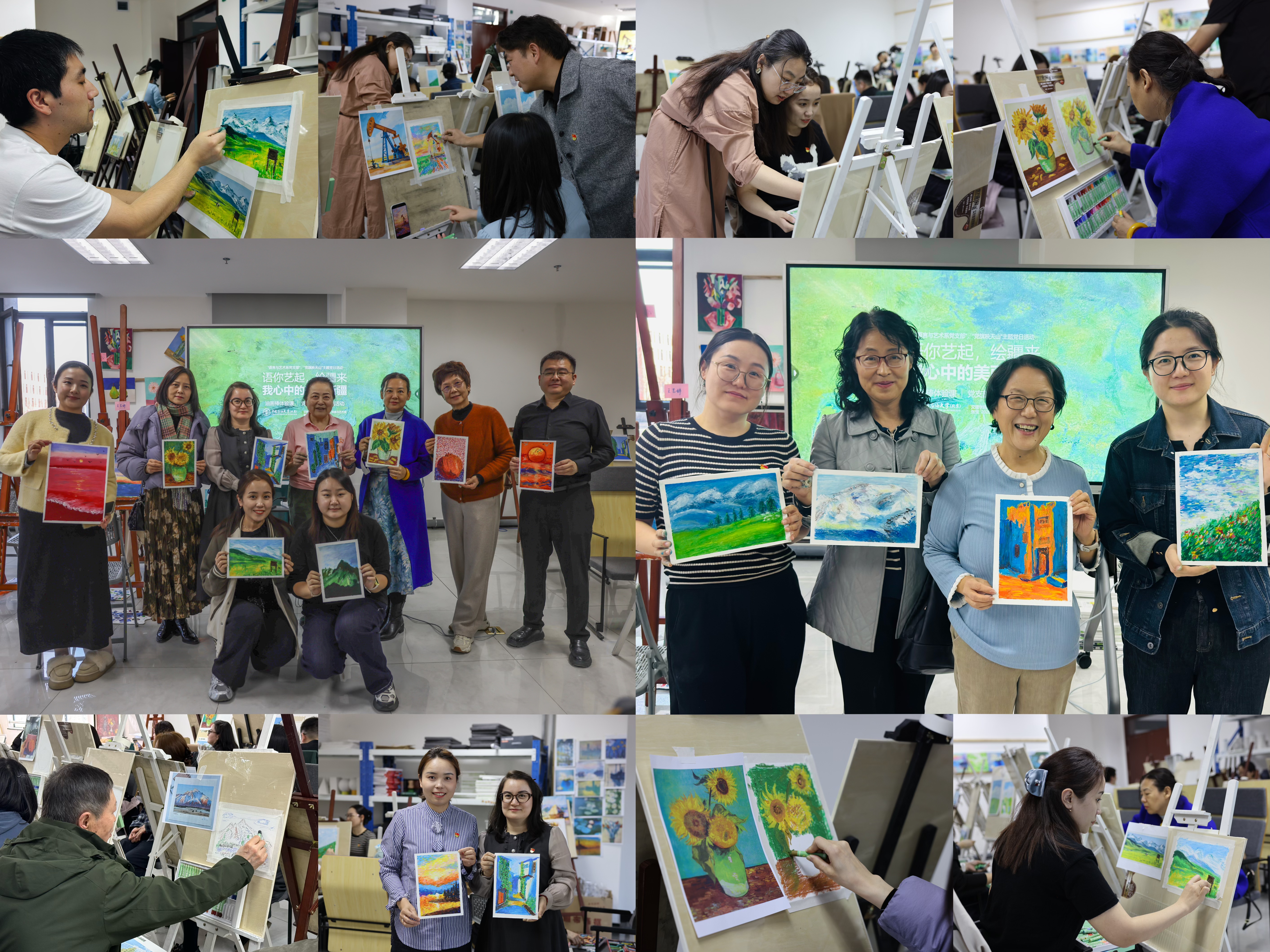 在张宝及其他艺术学科老师的专业指导下,党员教师们以油画棒为媒介,将专业技艺与对新疆的深情相结合,用色彩与线条勾勒天山的巍峨、草原的辽阔,描绘各民族同胞互帮互助的温情场景,定格新疆在新时代发展中的崭新面貌,把对这片土地的热爱、对边疆发展的期盼、对民族团结的坚守,一一融入每一幅创作之中。活动现场氛围热烈,党员教师们相互交流创作心得、分享对新疆故事的理解,在艺术实践中深化文化认同、凝聚奋进共识,既践行了“党旗映天山”的使命担当,也让校区美育工作从课堂延伸到实践,实现了“美育润心、文化铸魂”的育人效果。