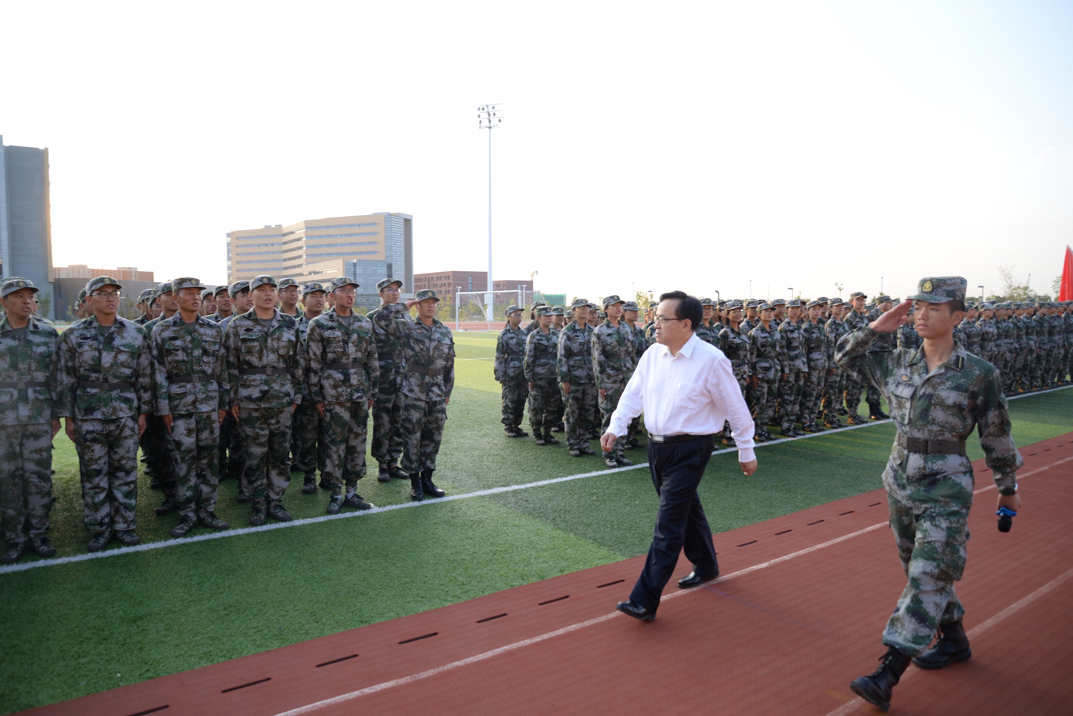 上午8时30分,典礼在雄壮的国歌声中拉开序幕。全体参训学生肃立,迎接校旗。伴随着激昂的检阅进行曲,张来斌对所有军训连队进行检阅。军训团精神饱满、铿锵有力的口号声响彻红旗操场。