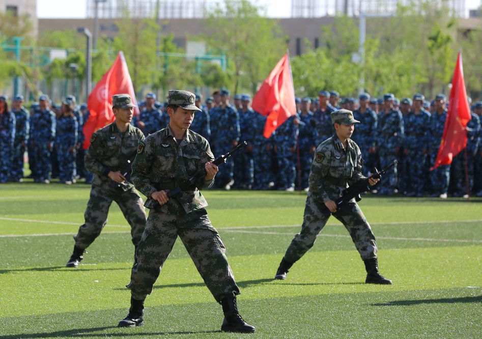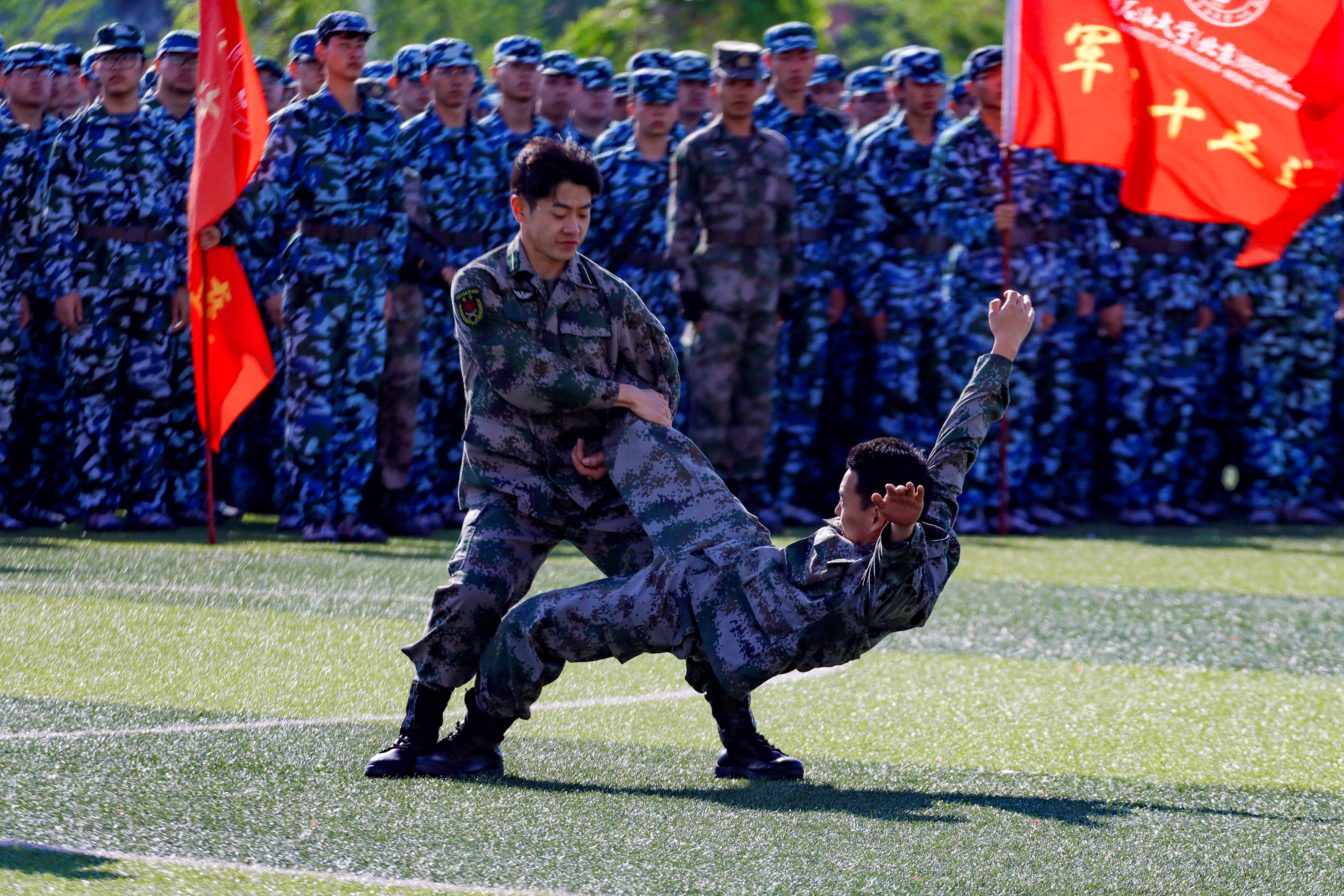 开训典礼上,承训教官们为现场师生展示了队列基础、擒拿技术、刺杀操等军事技能科目示范表演。与大多数高校军训不同的是,全体承训教官并非现役军官,而是校区退役复学的大学生。他们充分发扬“退伍不褪志”的品质,以实际行动引导学生传承红色基因,弘扬奋斗精神,擦亮青春底色。