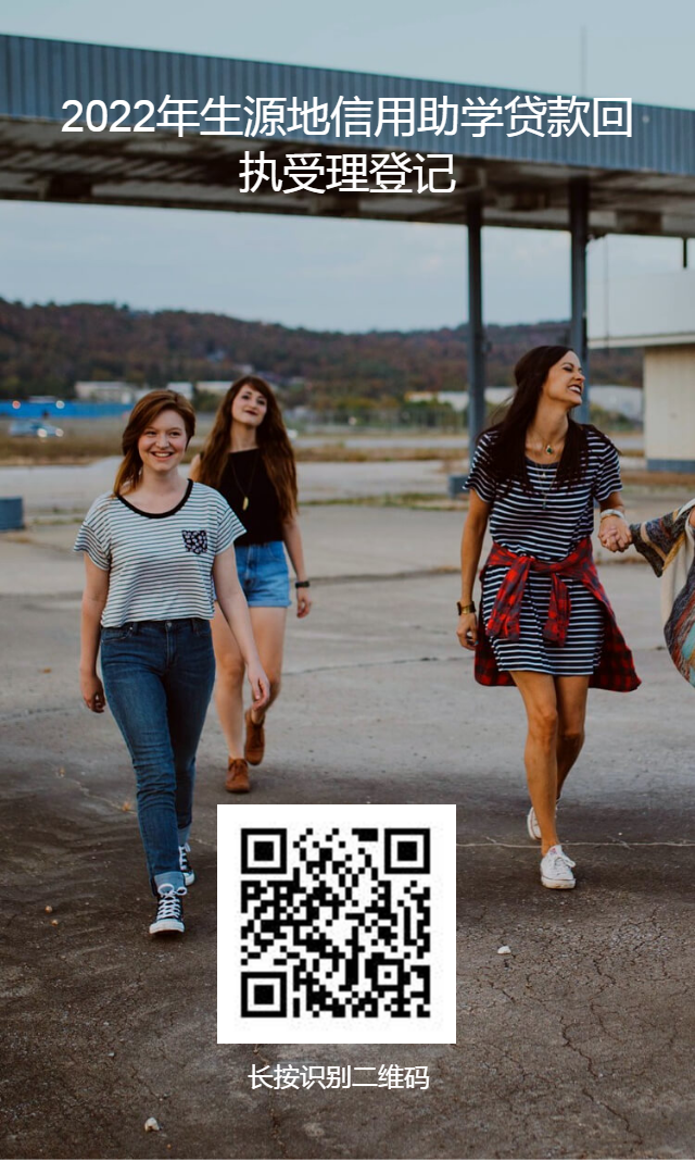 在家庭所在地申请2022年国家开发银行生源地国家助学贷款学生于9月15日前扫描下方二维码填写登记表登记生源地贷款回执校验码,并上传回执单照片或受理短信截图,请务必保证信息填写准确性,以免校验码填写错误导致贷款失败。