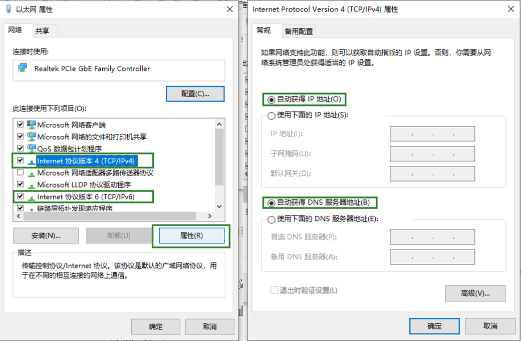 分别选择“Internet 协议版本 4”和“Internet 协议版本 6”,选择自动获取 IP 地址和自动获取 DNS 服务器地址,确定即可。以“Internet 协议版本 4”为例,如下图: