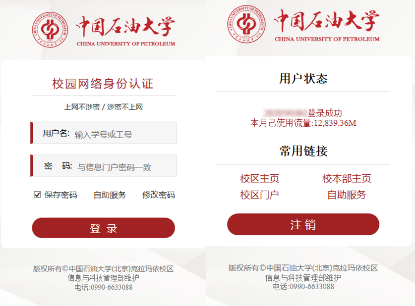 登录成功后会显示已使用流量情况,并可快速进入校本部官网、克拉玛依校区官网、校区门户和自助服务。