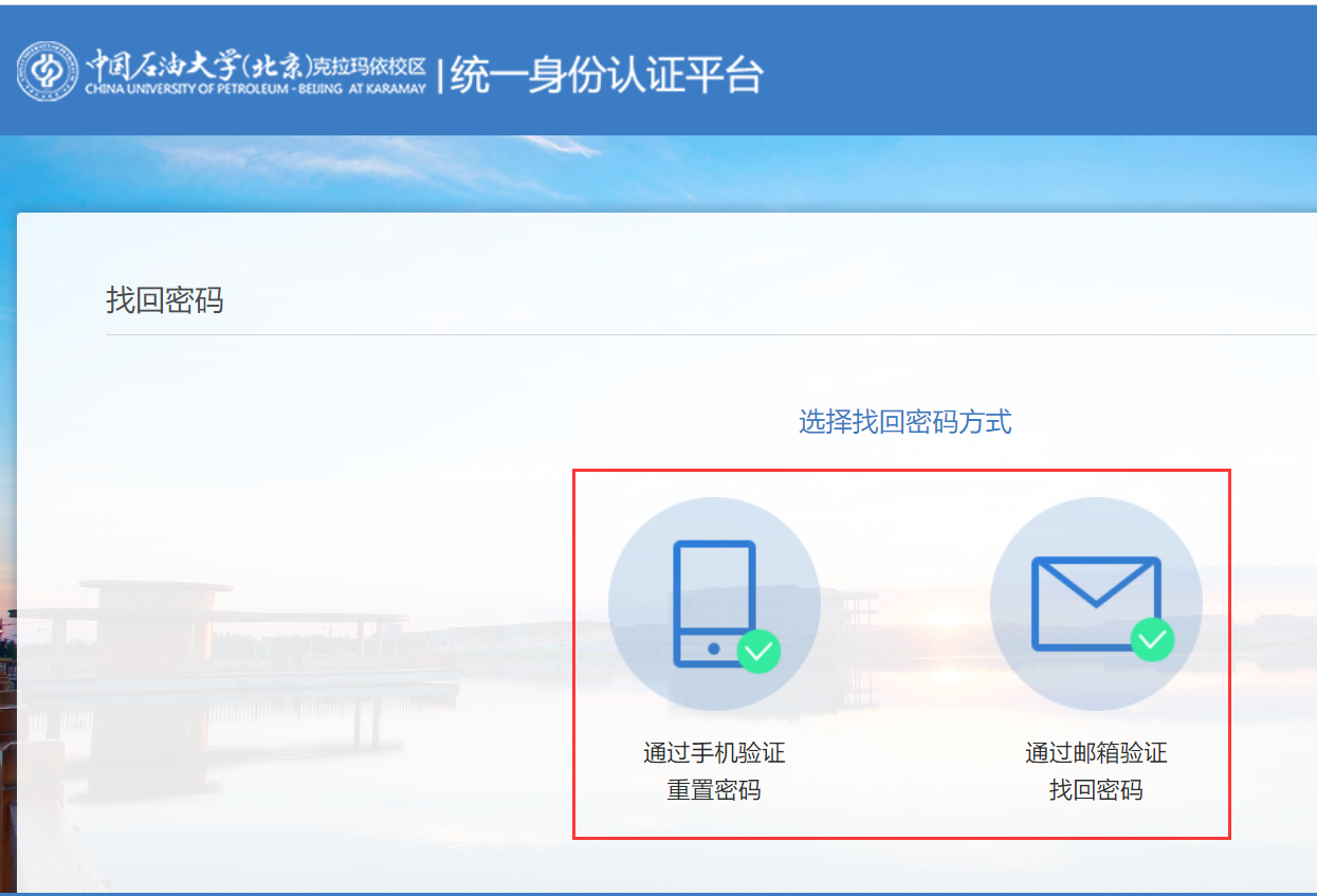 2、统一身份认证平台提供了两种找回密码方式,选择其中一种方式;