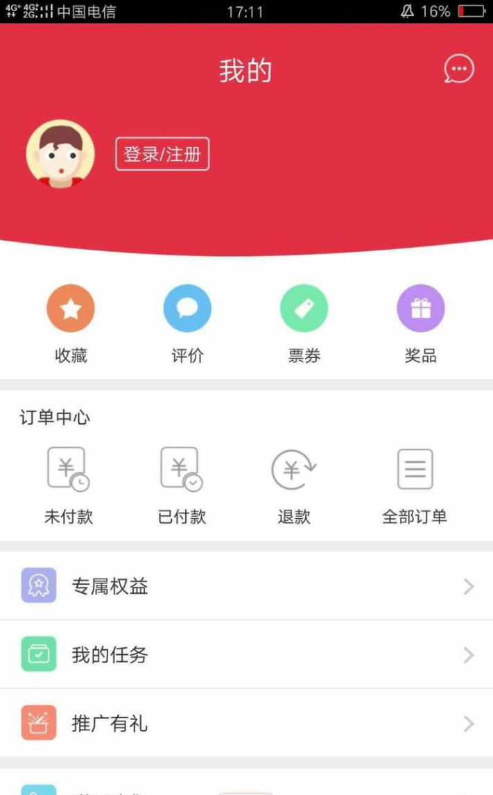 2.完成安装后,进入主页面,点击右下角“我的”,进行“登录/注册”。