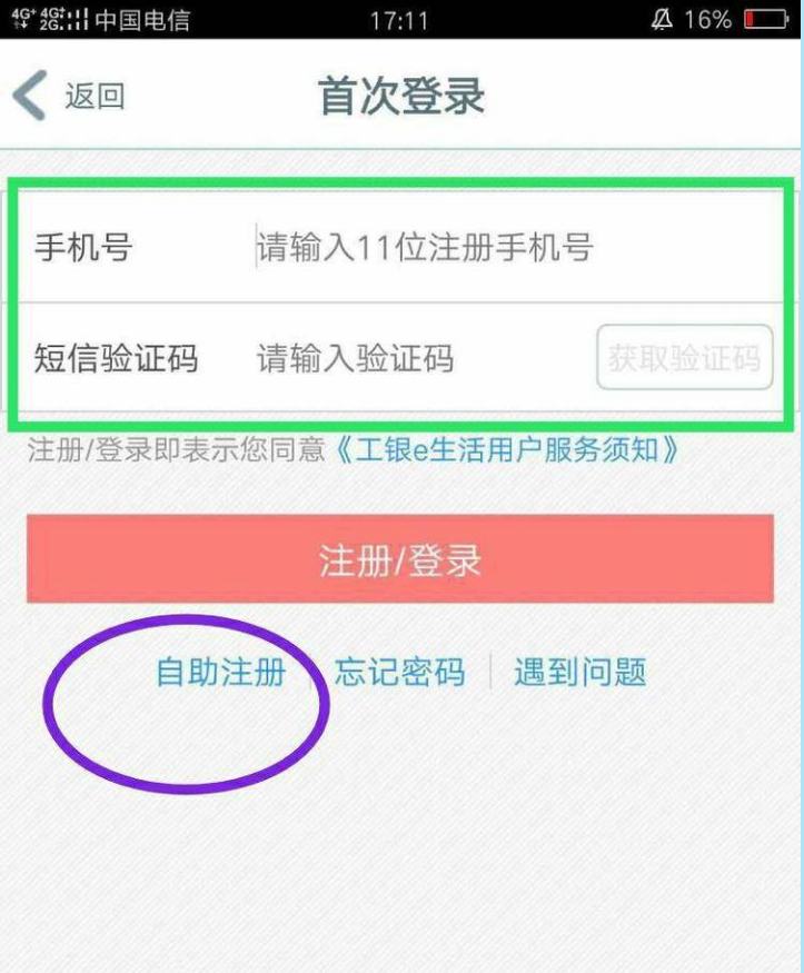 3.如果已注册过工行手机银行客户,直接在绿色框内输入手机号码,接收验证码后,在下个页面输入手机银行登录密码即可登录!如果未注册过工行手机银行客户需要点击紫色圈出的“自助注册”按页面信息进行注册!