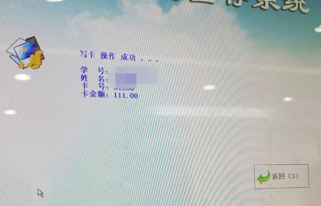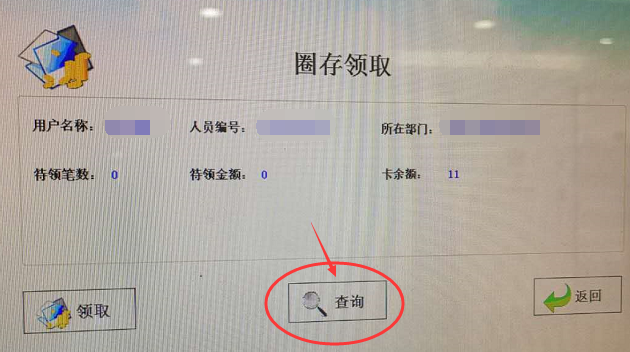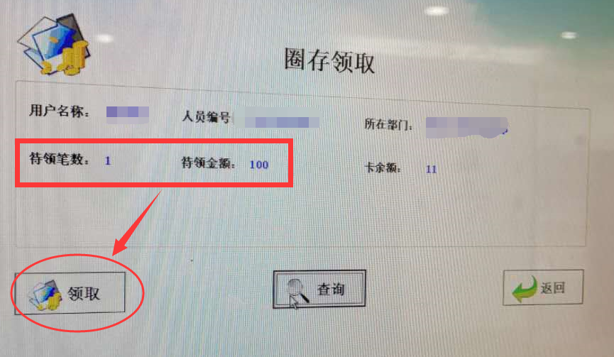 6.充值成功之后,还需要进行圈存领款,将校园卡放到圈存机读卡区,点击“圈存领款”按钮,点击“查询”按钮并核实待领笔数、待领金额与卡余额,确定无误后,点击“领取”按钮,系统会自动将待领款项写入到校园卡,提示“写卡操作成功”后即完成领款。