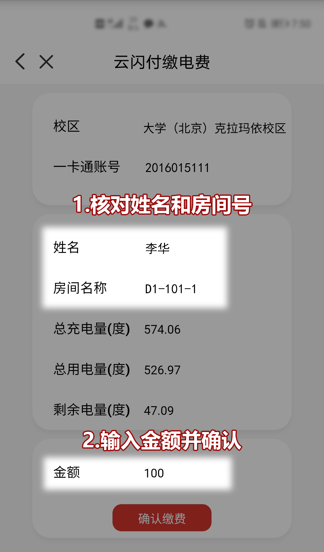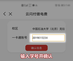 云闪付首页→数字校园→校园服务→电费缴纳→云闪付缴电费→输入一卡通账号(学号)→确认信息→输入金额→确认缴费→输入云闪付密码→支付成功。