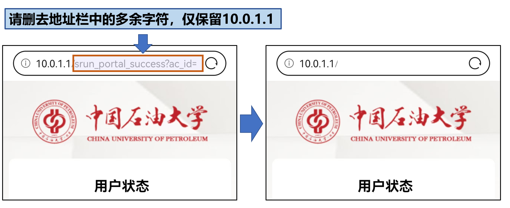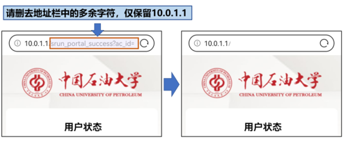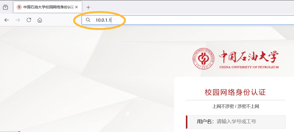 步骤2:连接wifi后,手动打开浏览器访问认证页面(网络地址:10.0.1.1),删去多余字符,仅在地址栏中保留10.0.1.1字符,然后访问。如下图。如仍无法解决,继续进行下一步。