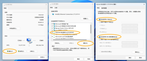 步骤3:点击“属性”——双击“Internet协议版本4”——勾选“自动获取IP地址”——勾选“自动获取DNS服务器地址“——确定