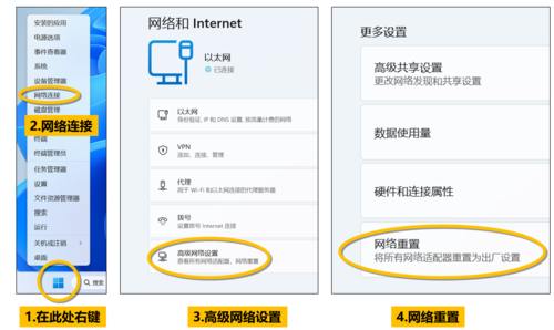 步骤4:进行网络重置操作,重启电脑,重新连接wifi,重新访问认证页面(网络地址:10.0.1.1)。网络重置方法(以win11为例,其他系统重置方法请自行搜索):在windows徽标(开始菜单)处右键——网络连接——高级网络设置——网络重置。