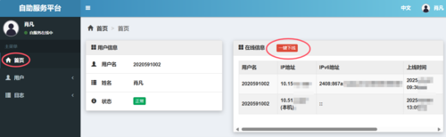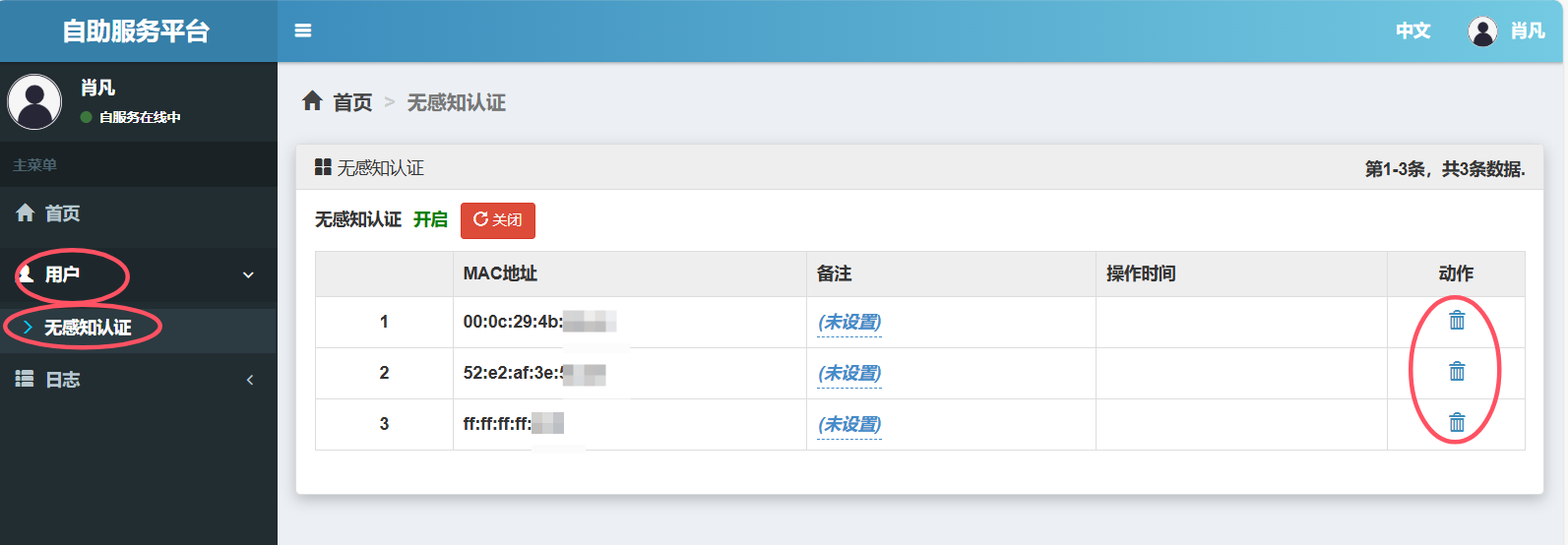 步骤1:打开浏览器→访问认证页面(网络地址:10.0.1.1)→进入【自助服务】页面→用户(左侧边栏)→无感知认证→删除所有mac地址;