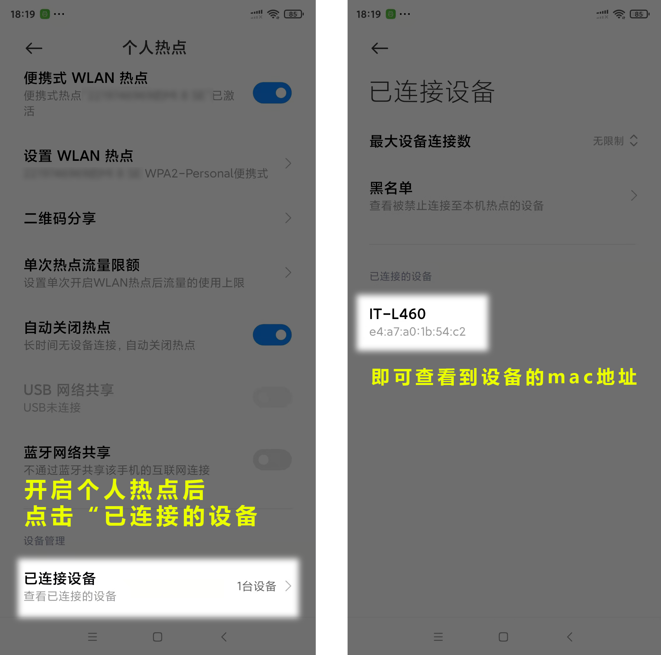 开启手机wifi热点,将设备接入热点中,点击“已连接的设备“,即可查看到设备的mac地址。