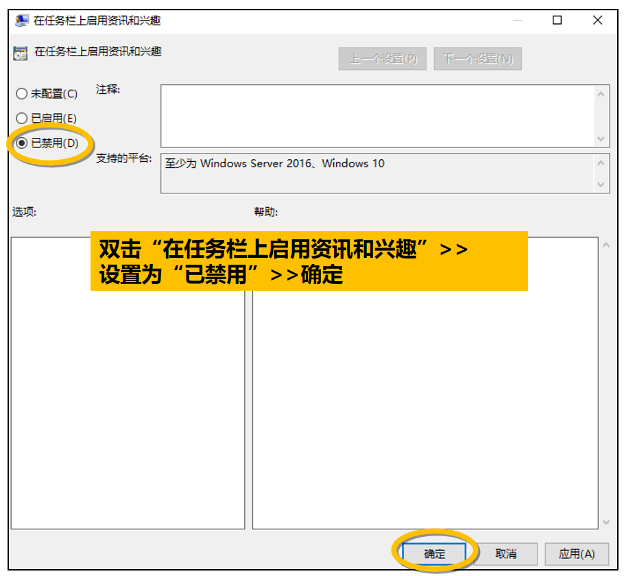 启动组策路>>计算机配置>>管理模板>>Windows组件>>资讯和兴趣>>在任务栏上启用资讯和兴趣>>设置为“已禁用”。