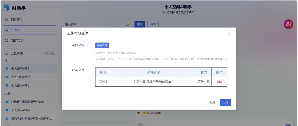 点击“上传本地文件”,用户可以上传CSV、DOC、DOCX(word 建议使用 DOCX)、PDF、XLSX等文件格式,如需上传PPT,请先转换成PDF格式再上传。