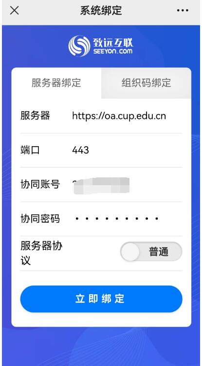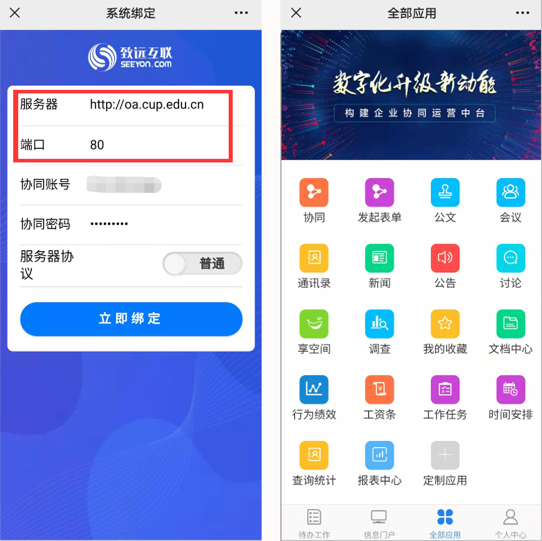 1.配置信息:服务器:https://oa.cup.edu.cn,端口:443;